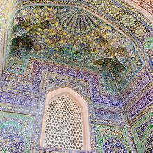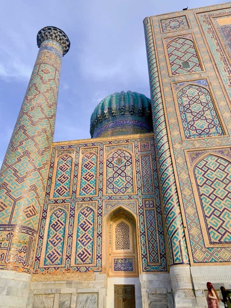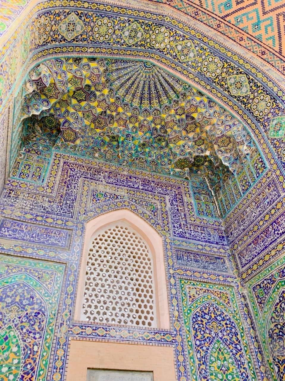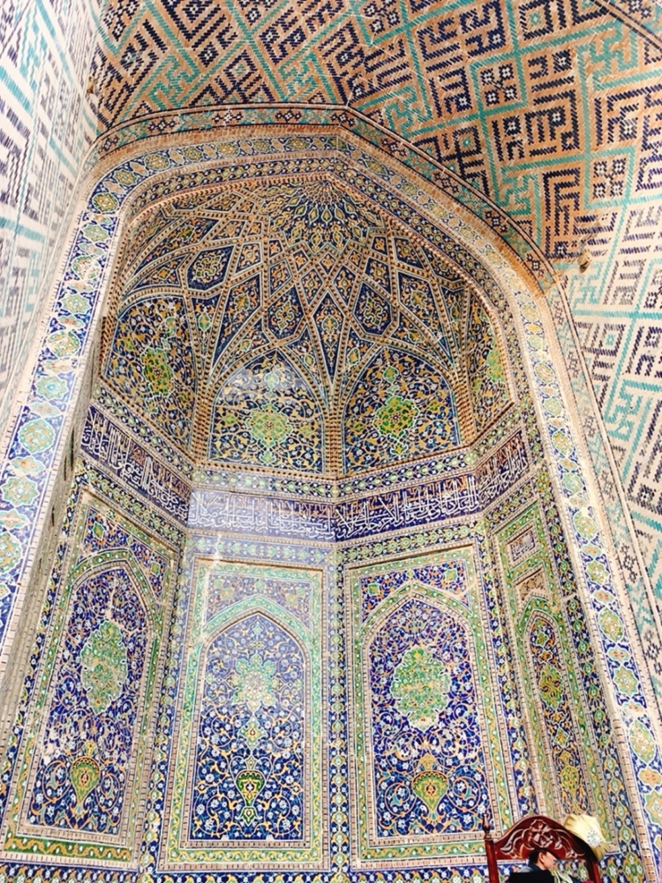 シェルドル・マドラサの左右両方にある、エメラルドグリーンのドームのような装飾がキレイでめっちゃ好きでした! 描かれた模様もとっても細かくて…。