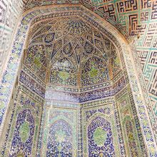 ファサードには、偶像崇拝を否定する当時のイスラム教義に反して動物が描かれているのですが、それがこのシェルドル・マドラサの一番の特徴です。 描かれているのは、鹿を追いかける虎。 教義に反しても伝えたかったメッセージは、「虎を学生、鹿は知識を表し、学生は永遠に知識を追いかけよう」という事らしいです。