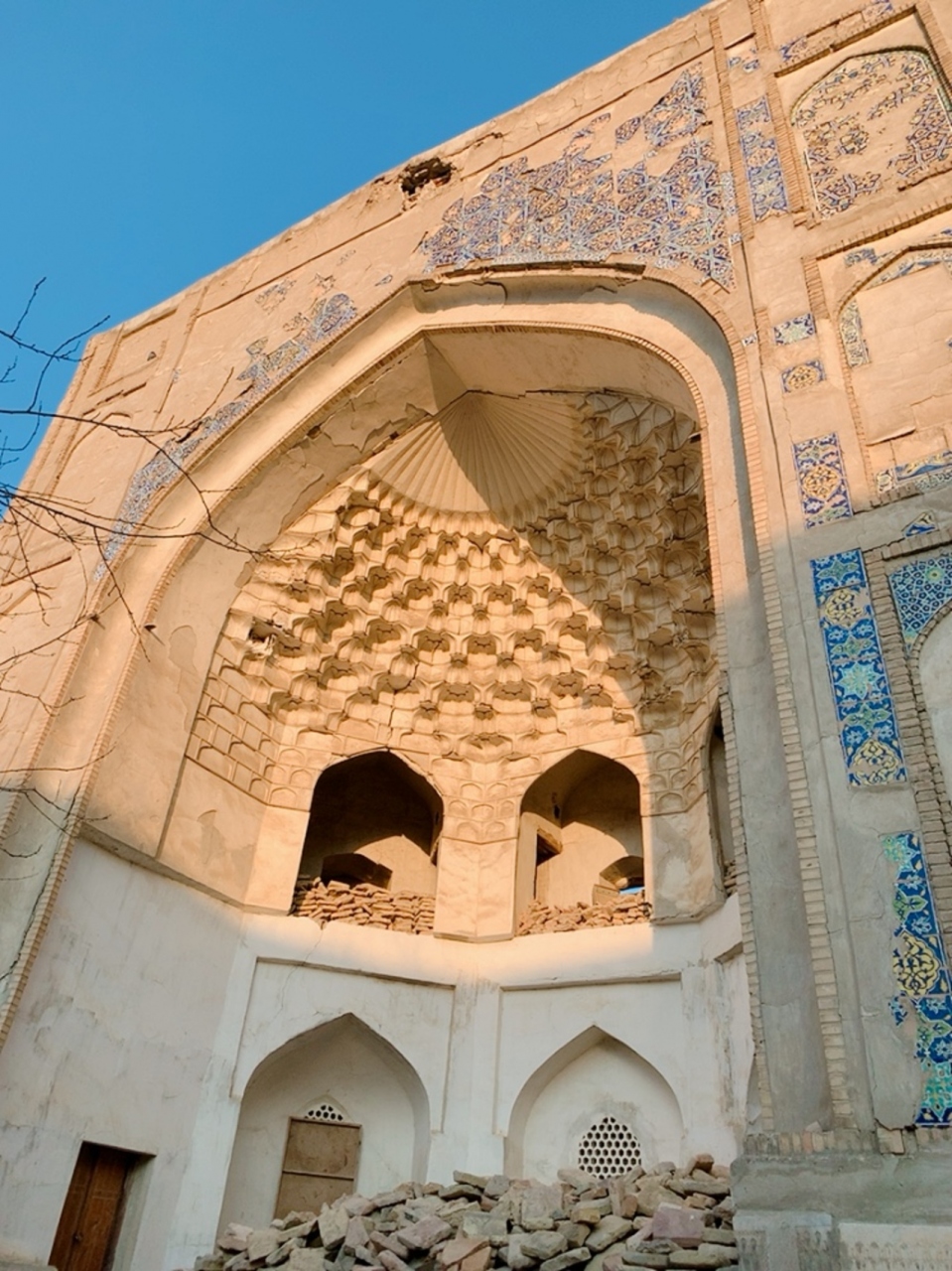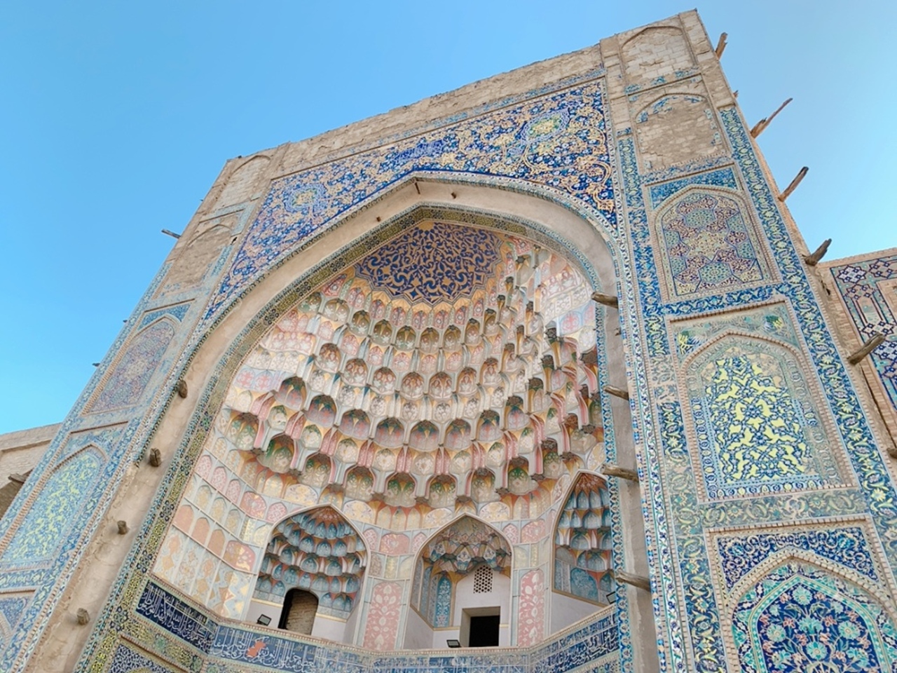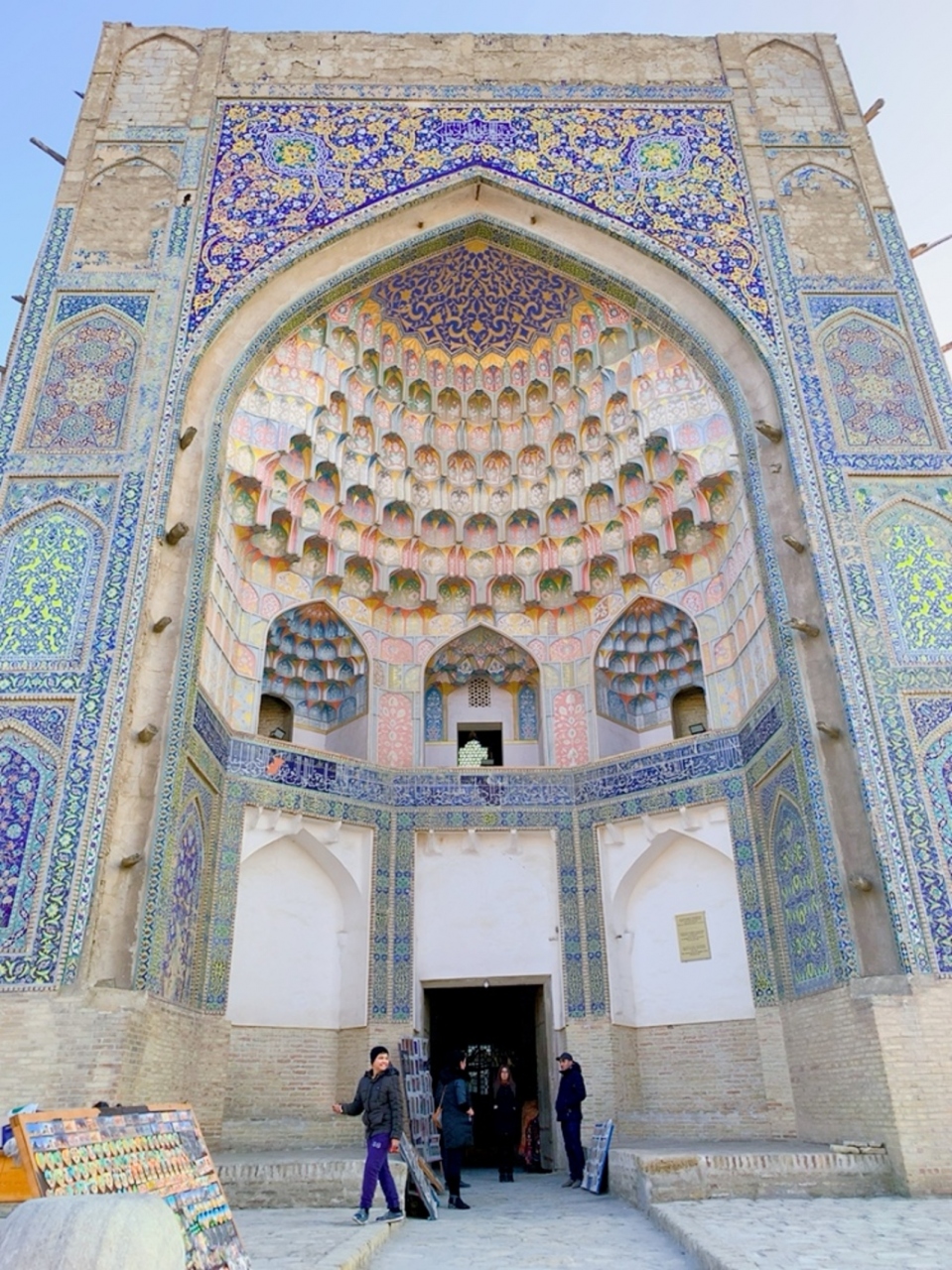 タキザルギャロンを背にしてちょっと進むと、向かい合わせで2つの大きなマドラサが建っています。 1つはウルグベク・マドラサで、装飾だけで比べたらかなり質素な感じ。 それに対して、こちらのアブドラジス・ハン・マドラサは、ファサードの装飾が本当に素晴らしく、内部も是非見てみたい!と思って、吸い込まれるように入場料の8,000スムを支払って中へ入ってみたのですが…。