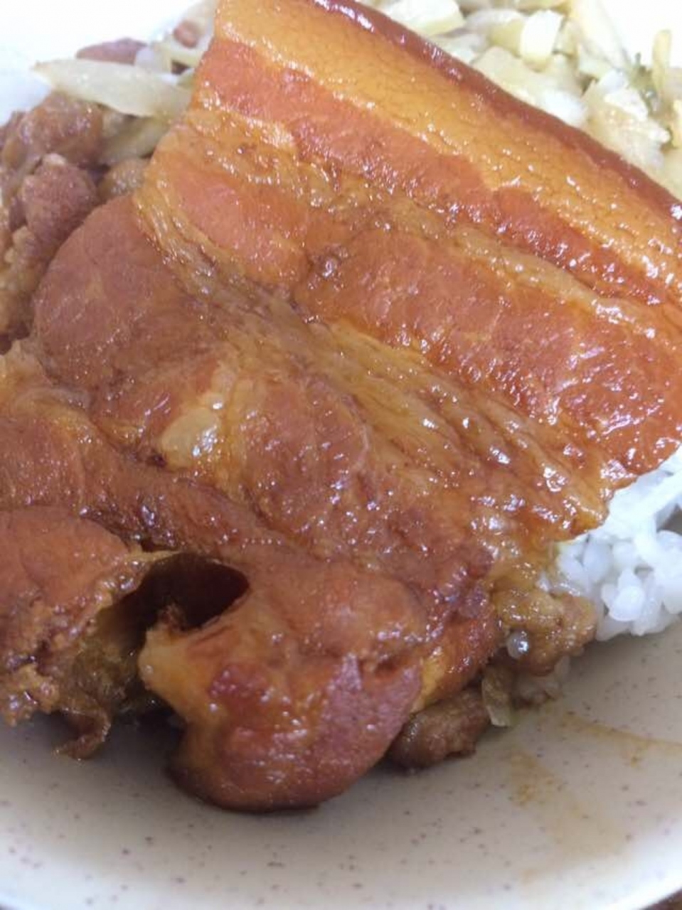 ひげの生えたおじさんがこの鬚張魯肉飯のキャラクターです。台湾の特に台北と新北ではよく見かけました。コン肉飯におかずを3種類選んで食べました。野菜炒めは、1種類の青梗菜にニンニクが効いた味でした。おいしかったです
