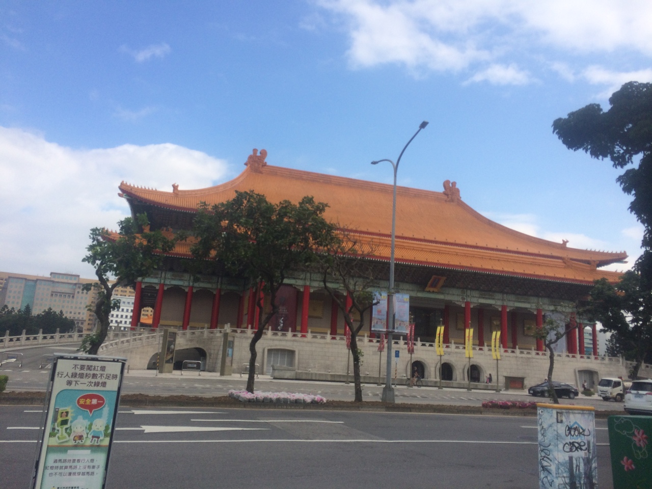 通り過ぎただけでしたが、鮮やかなエンジ色で中華な建物が2軒左右対称に並んでいました。自由広場の門や中正紀念堂もこの国家戯劇院と同じ敷地にありました。当日は、オペラのコンサートをやるようで、旗がなびいていました