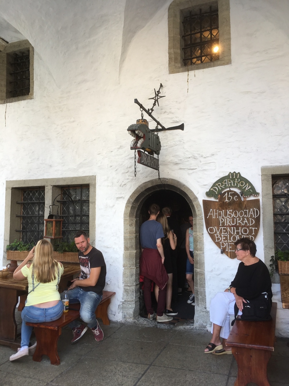 市庁舎の1階にある、中世の食事が出来るカフェです。メニューは至ってシンプルで、エルクのスープとパイ、ソーセージしかありません。又食器も中世で使われていた様な分厚い素焼きお皿で、中世風のコスチュームを着た店員さんが運んでくれます。店内は薄暗く、蝋燭の光で食べます。尚外にも席はありました。食事の写真は暗くて上手く映らなかったので残念でした。