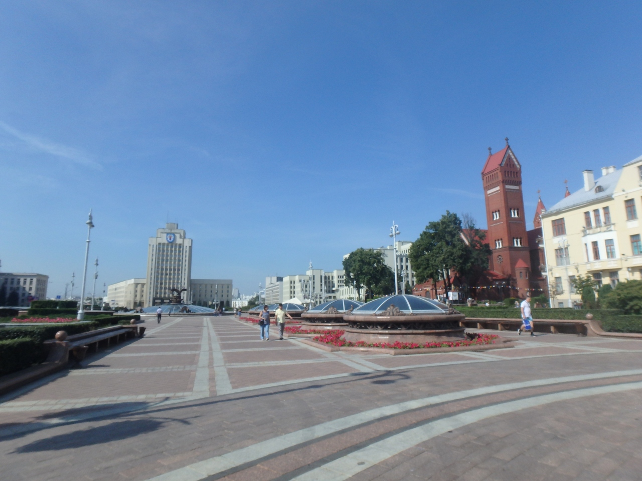 聖シモン 聖エレーナ教会が面しているのがこの広場です。教会以外は郵便局などの第2次世界大戦後に造られた無機質な建物が並んでいます。ミンスク駅から徒歩7分くらいと近く、レーニン像や噴水もあるので、ミンスクに行ったら行くべきスポットだと思います。