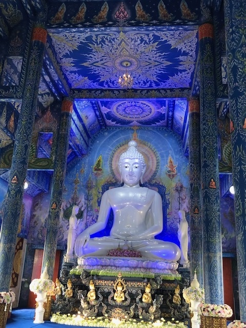 チェンライの青のお寺です。建物がすべてブルーで統一されインスタ映えします。ここには元々小さなお寺があったようですが、災害で壊れたために再建にあたってこのようなお寺になりました。ワット ローン クンの白と対比する青のお寺です。