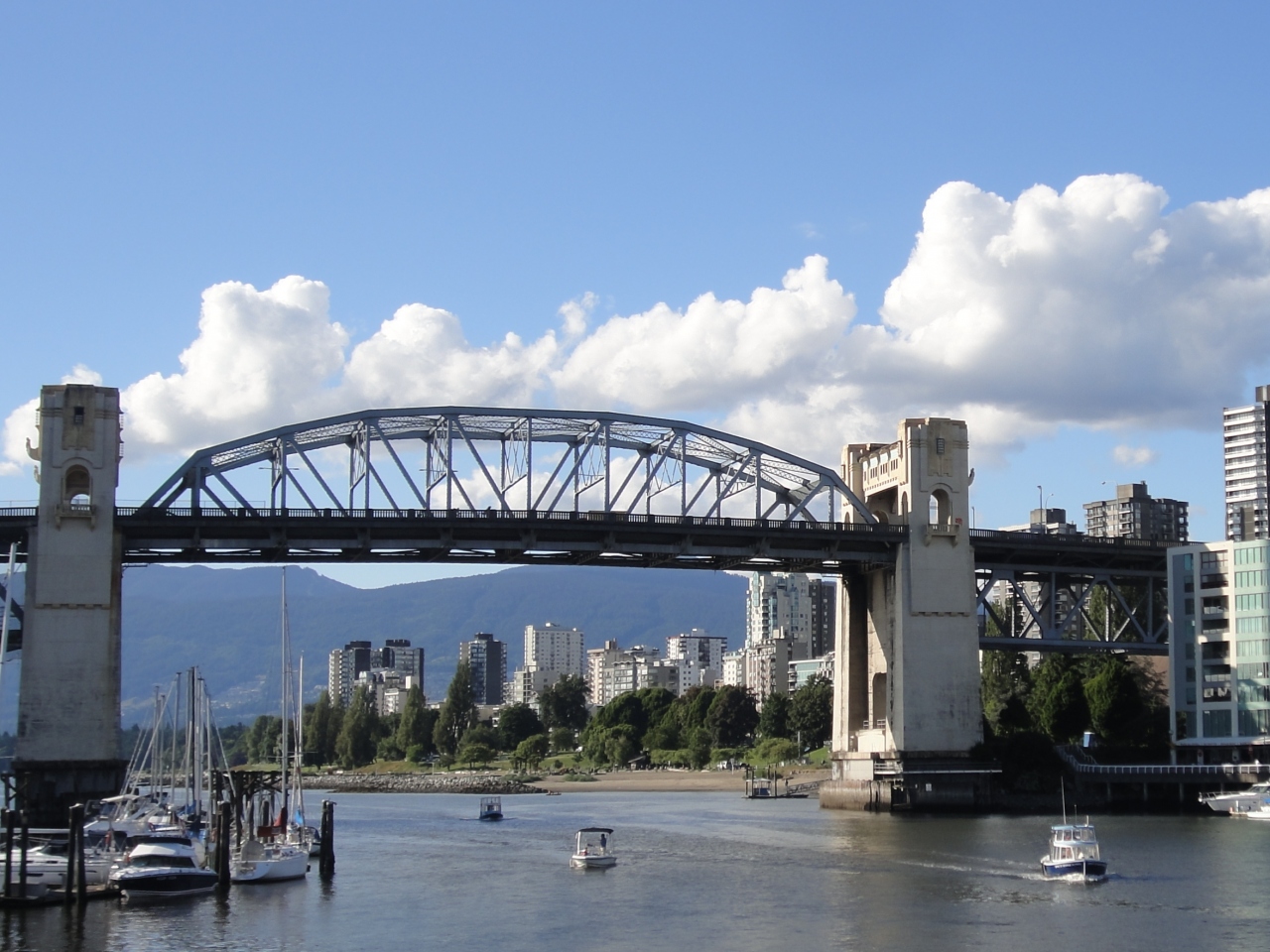 ダウンタウンから対岸のグランビルアイランドに行くには、何社かフェリーが運航しているが、カラフルなThe Aquabusよりちょっと大きめな青いのがFalse Creek Ferriesフォールス川フェリーで、現地ではseabusと呼ばれているようだ(写真右下)。Burrard Street Bridgeと比べ非常に小さいく頼りないものの、観光気分でゆっくり景色を眺めながらクリークを渡るのも楽しいものだった。