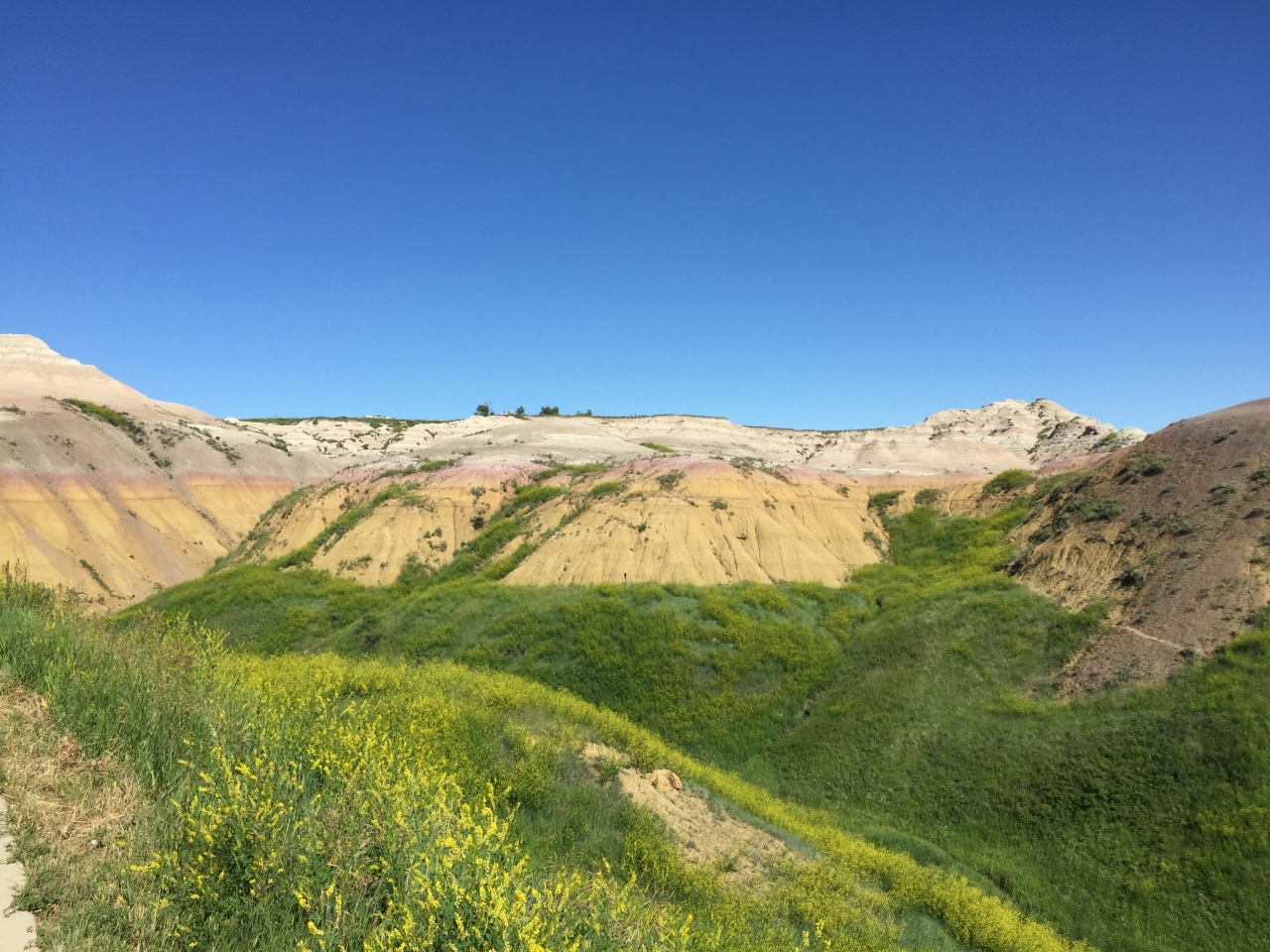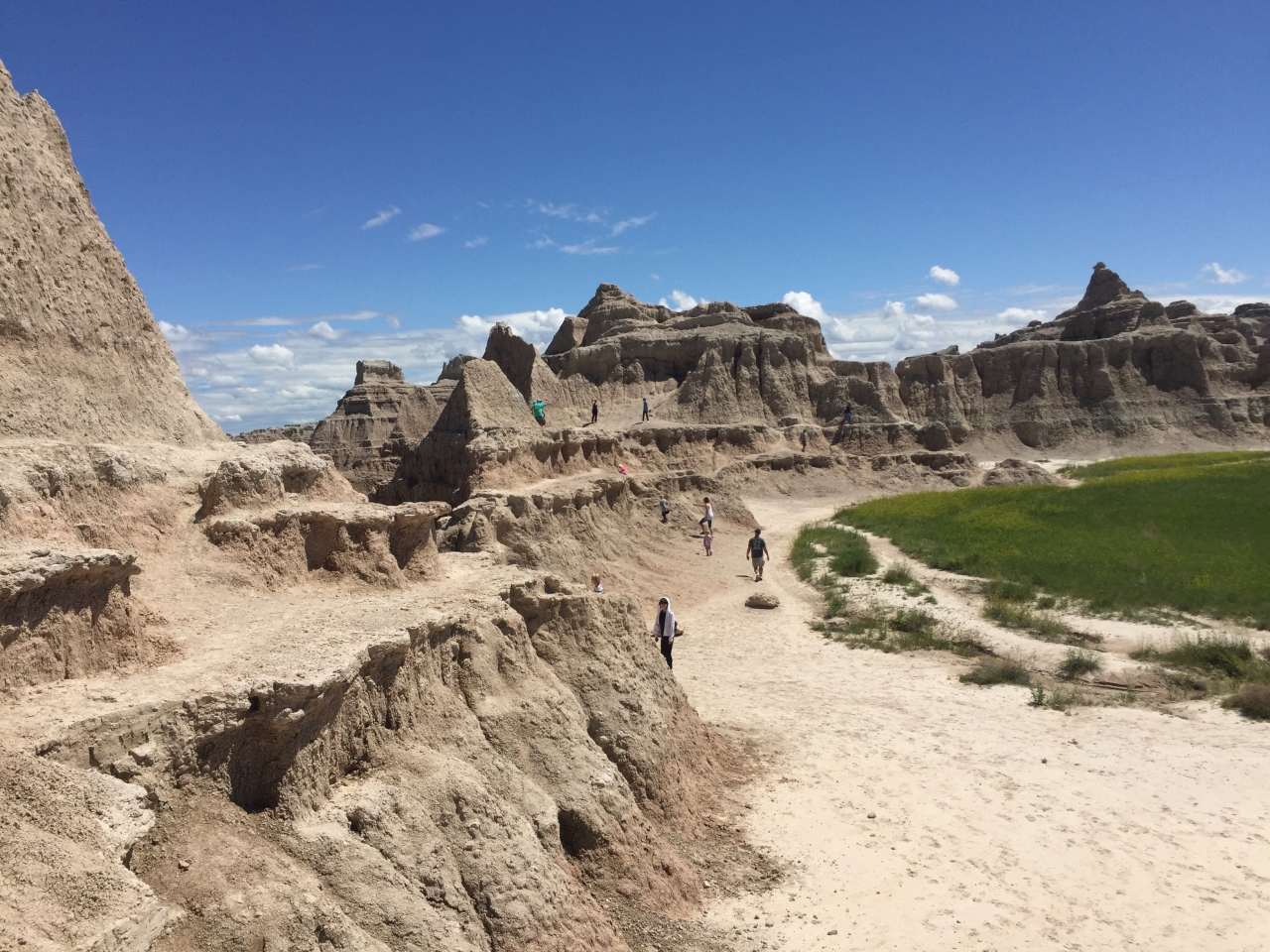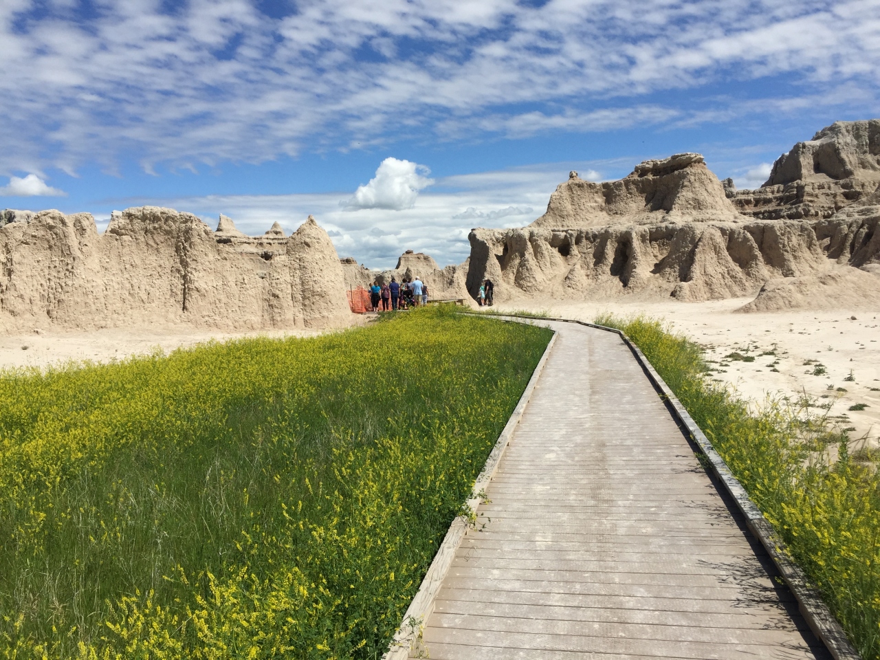 国立公園内の見どころスポットを繋ぐループロードは、尖った岩群や大草原など地球創成の自然を順次見ているような気にさせてくれます。見どころはたくさんあります。シダーパスにあるトレイルでトレイルヘッドの美しさがバッドランズ国立公園を代表する景色になっているドアトレイル。シダーパスの車椅子でもアクセスできる短いトレイルィンドウトレイルです。ノッチトレイルでは丸太階段が何か所かあり、上りと下りは交互です。トレイル用の靴が必須でスカートは不可。6月は黄色い花のキレイな時期でした。そしてノースイーストエントランスからループロードを進みシダーパスの次にビジターセンターがあります。正面は美しい景色です。化石の道は哺乳動物の現れたころの化石や2600~7700万年前、ここが海や湿地帯だったころの生物の化石が発見され、わかりやすいように展示されたトレイルです。イエローマウンツも異次元の絶景。最後はケビンコスナーのダンスウィズウルヴスのシーンも撮影に使われたピナクルズです。