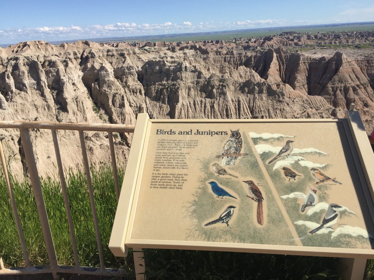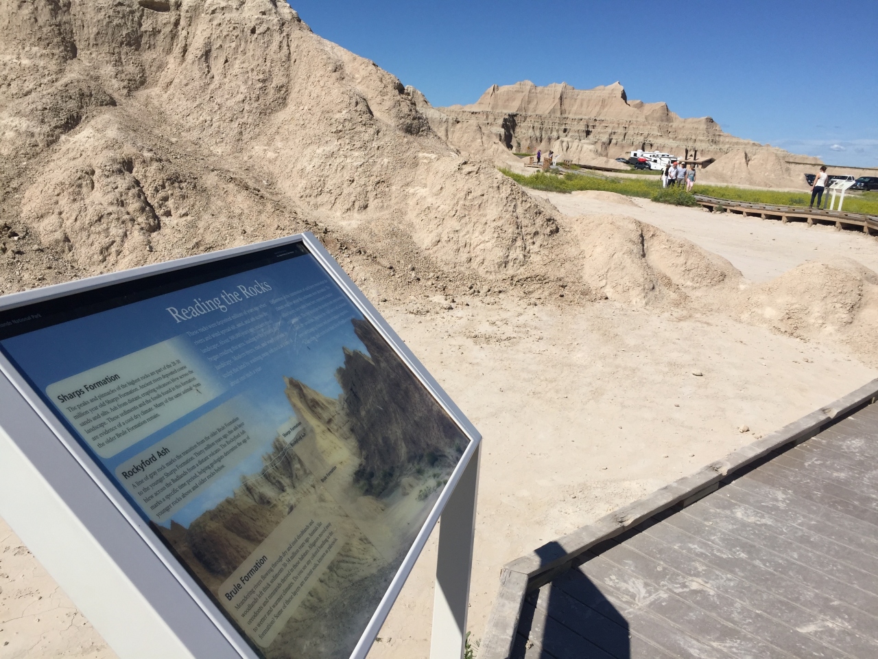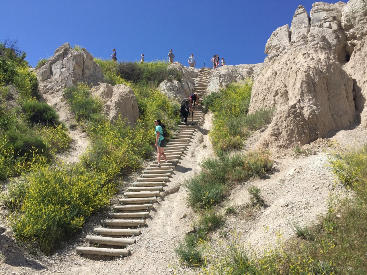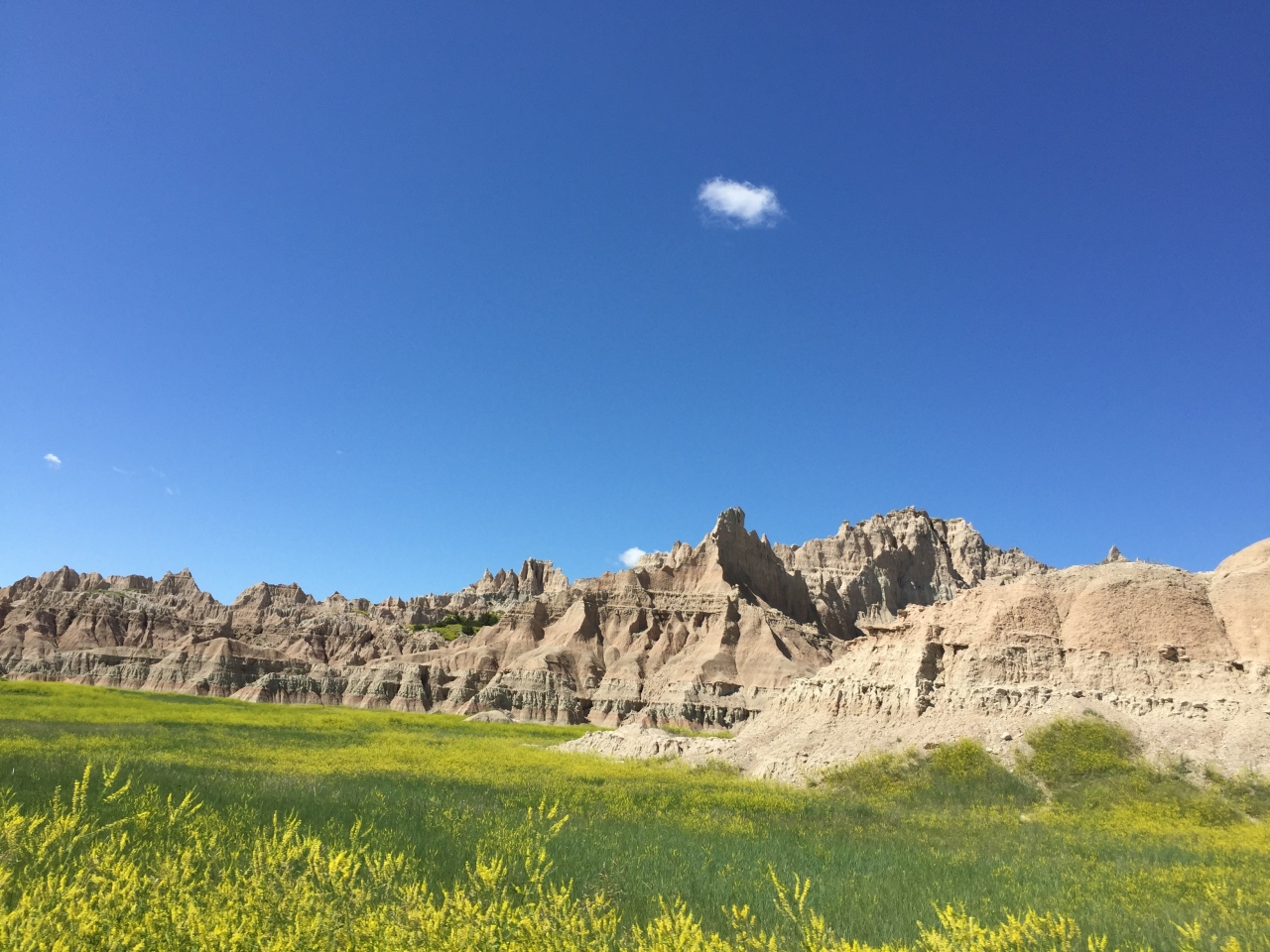 国立公園内の見どころスポットを繋ぐループロードは、尖った岩群や大草原など地球創成の自然を順次見ているような気にさせてくれます。見どころはたくさんあります。シダーパスにあるトレイルでトレイルヘッドの美しさがバッドランズ国立公園を代表する景色になっているドアトレイル。シダーパスの車椅子でもアクセスできる短いトレイルィンドウトレイルです。ノッチトレイルでは丸太階段が何か所かあり、上りと下りは交互です。トレイル用の靴が必須でスカートは不可。6月は黄色い花のキレイな時期でした。そしてノースイーストエントランスからループロードを進みシダーパスの次にビジターセンターがあります。正面は美しい景色です。化石の道は哺乳動物の現れたころの化石や2600~7700万年前、ここが海や湿地帯だったころの生物の化石が発見され、わかりやすいように展示されたトレイルです。イエローマウンツも異次元の絶景。最後はケビンコスナーのダンスウィズウルヴスのシーンも撮影に使われたピナクルズです。