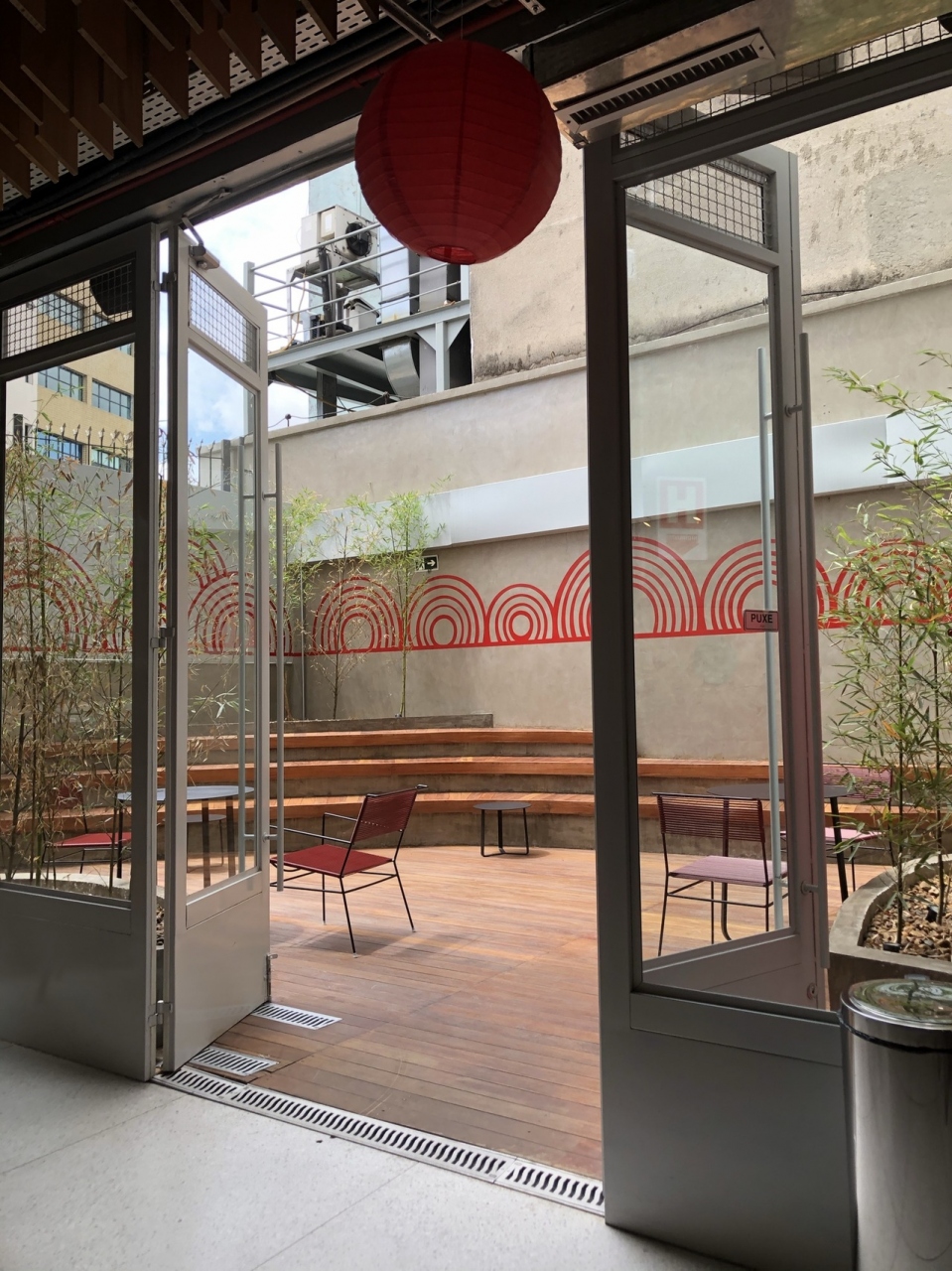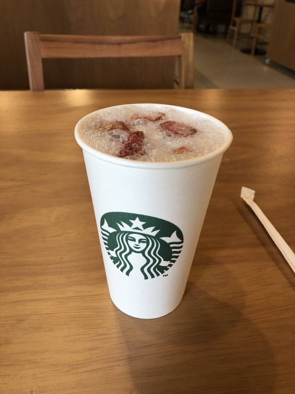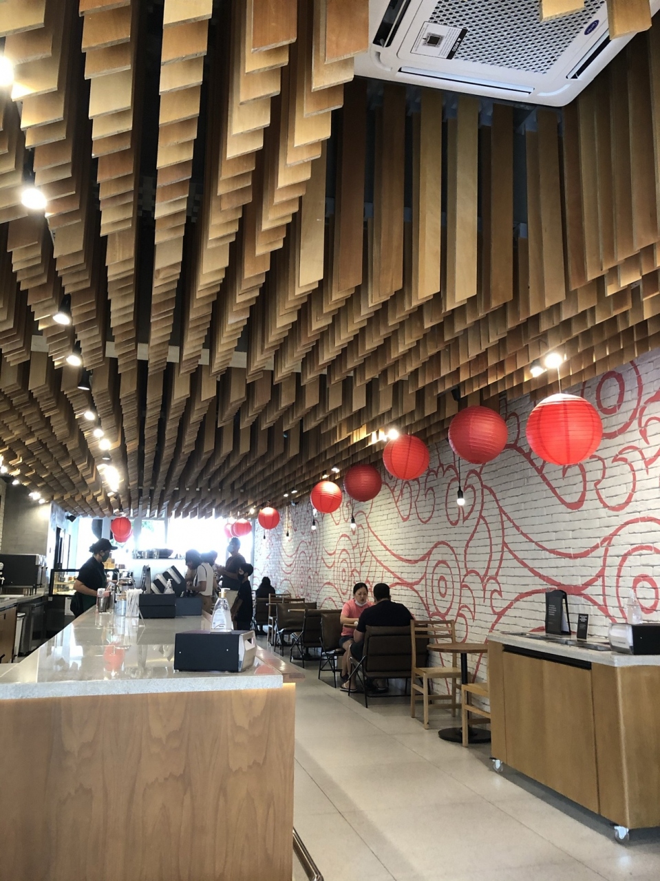 店内は何をモチーフにしているかはわかりませんが、アジアテイスト。期間限定の謎のピンクドリンクをオーダー。中にはドライされたイチゴが入っていましたが、味はイマイチ。