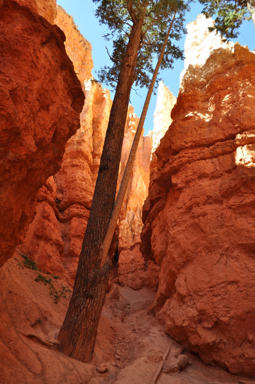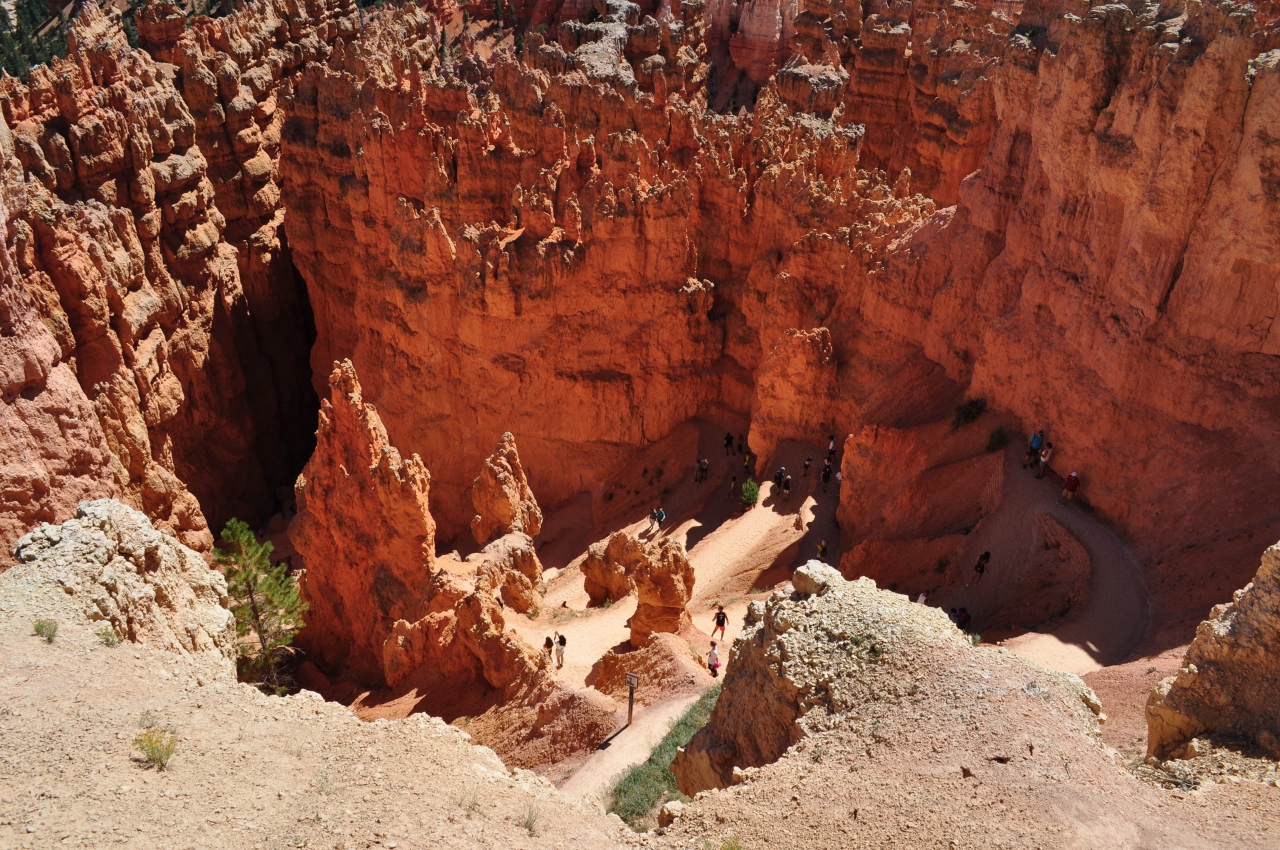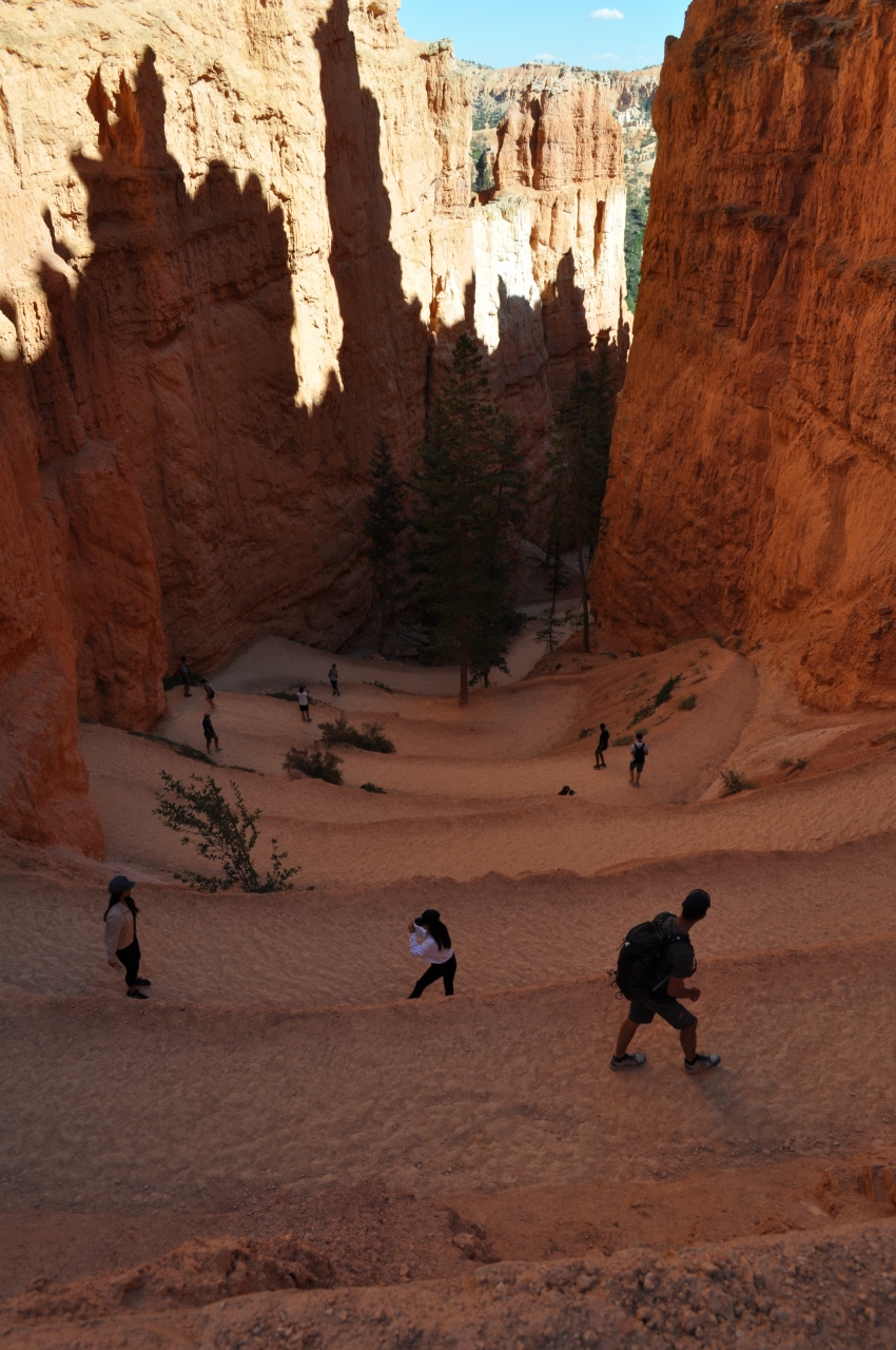 サンセットポイントから下るトレイルです。ブライスキャニオンにはいくつかトレイルがありますが、時間、難易度共にお手軽なレベルなので、人気のトレイルだと思います。時間があんまり無いかたは、サンセットポイント側下ると始めにウォール街と呼ばれるスポットがあるのでそこまで行って引き返すのもありだと思います。