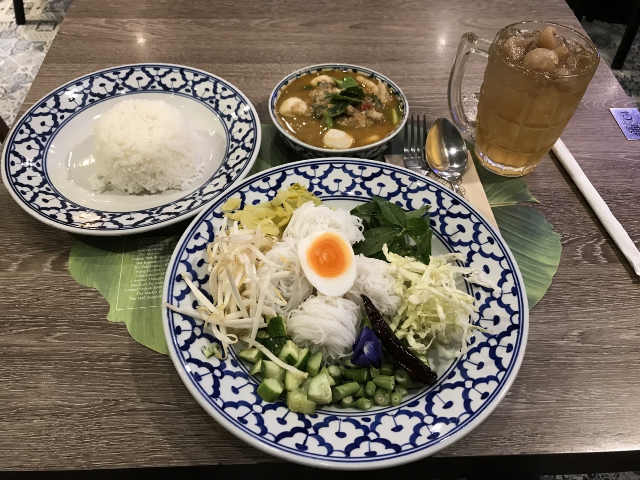 定番料理から東北部のローカル料理もあるのだが、ランチメニューのカレー(チキン)を注文。麺料理が有名な店なので麺とライスを両方注文。麺は素麵の感じ。カレーに付けるとつけそばの感じがして美味しい。また麺の横に色々な野菜があるのだが、それを混ぜても良い。ライスは口直しに良い。