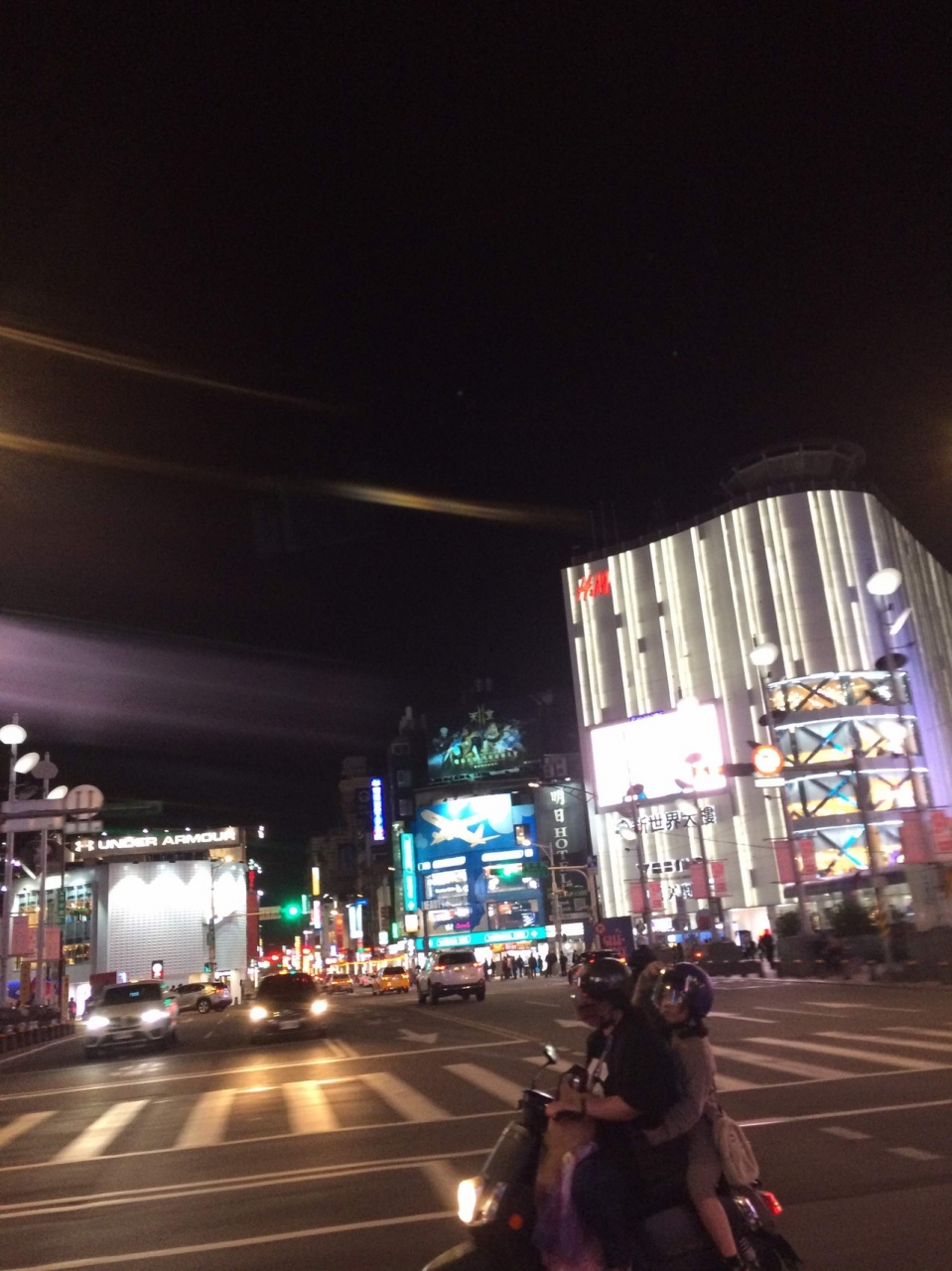 西門駅を出ると、西門紅楼、H&Mのお店、映画館などがありました。人が多かったです。交差点では、かなりの車、バス、バイクが往来していました。新しいカフェやチェーン店のドリンク店以外にも老舗の麵屋などがあります。