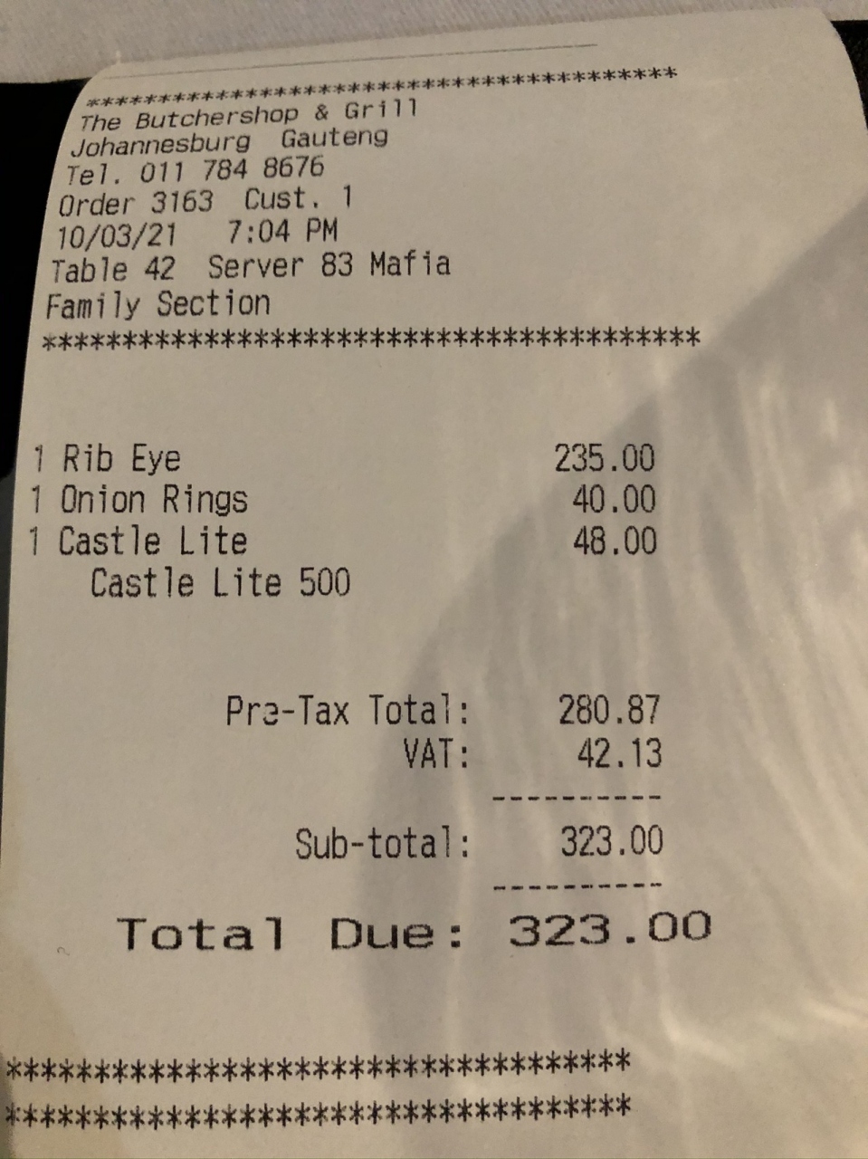 1日目は昔よく食べた思い出のRibEye。値段は235ZARで1年前と変わらず。