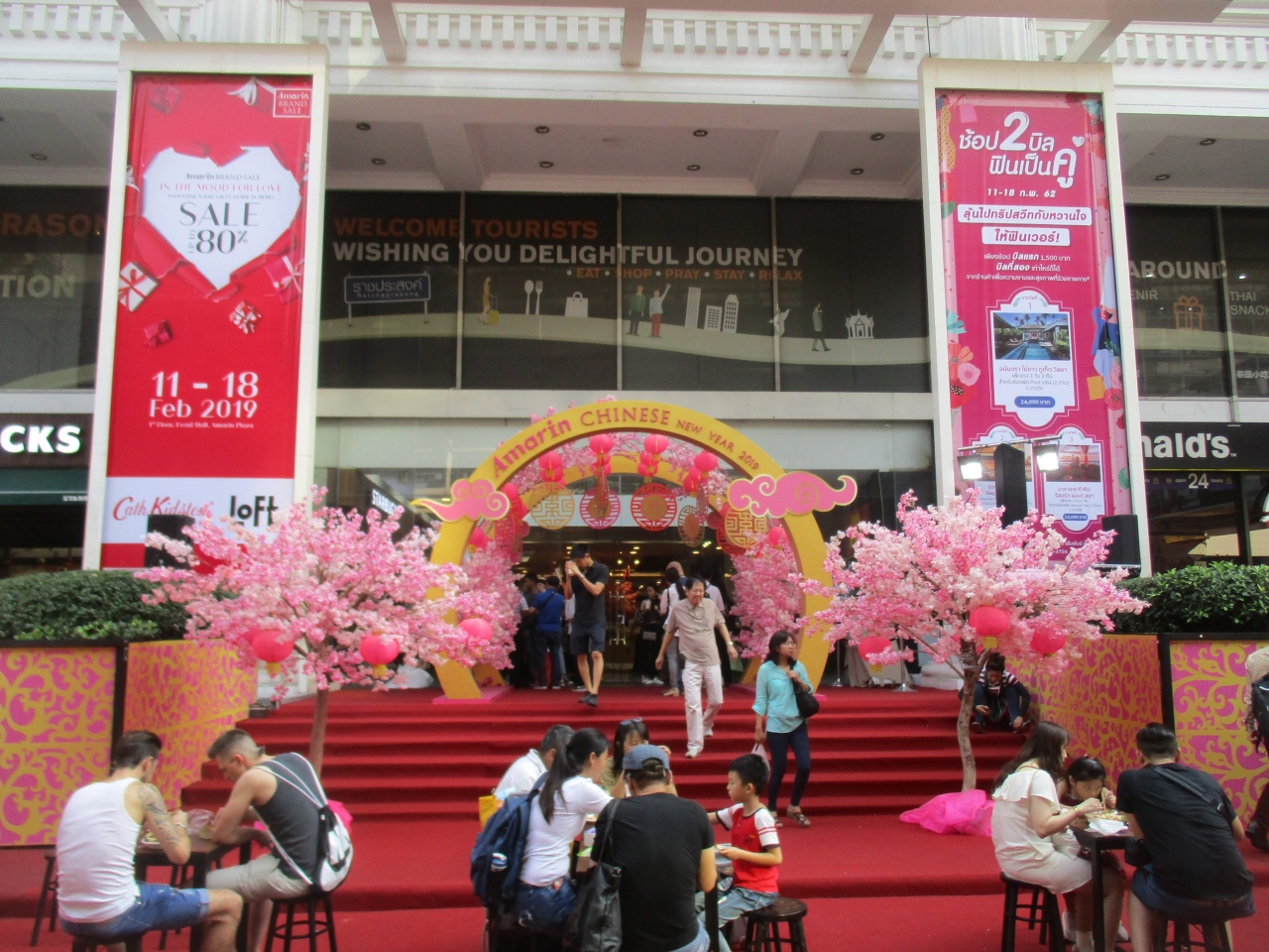 2019年の旧正月は2月5日ということで、旧正月まっただなかのアマリンプラザに訪問しました。自国ではなくバカンスをバンコクで迎える中国人旅行客を見かけました。1階のイベント会場では早速旧正月シーズンのセールが開催されていました。