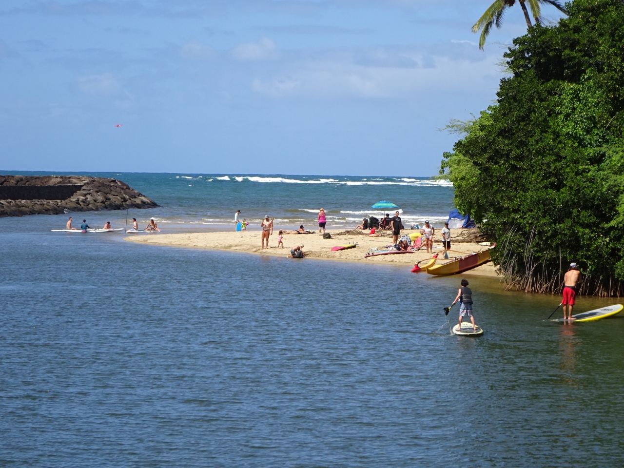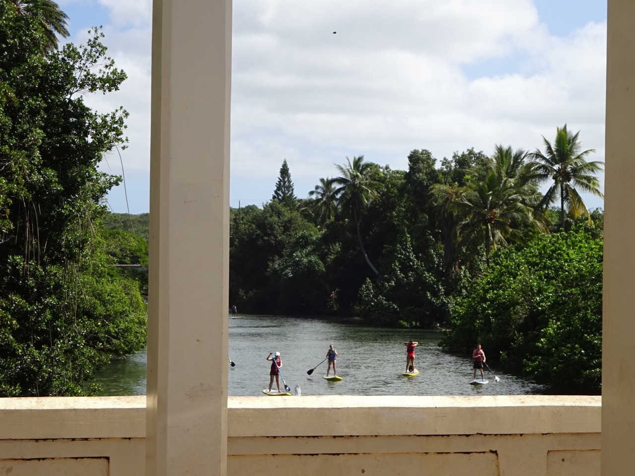 海のそばの橋からは、スタンドアップパドルやボートで川を下っている人たちがいました。