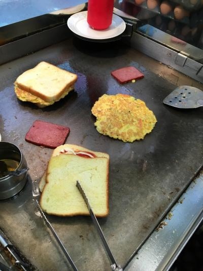 何回も食べに来ているのに何故かリピしてしまう店です。店頭でトーストを作ってもらえます。カリカリのトーストの中には、溶き卵と、キャベツや他の野菜。スペシャルトーストにしたので、ハムやチーズも入っています。厚みのわりに、フワフワで具ともソースとも相性が良い。
