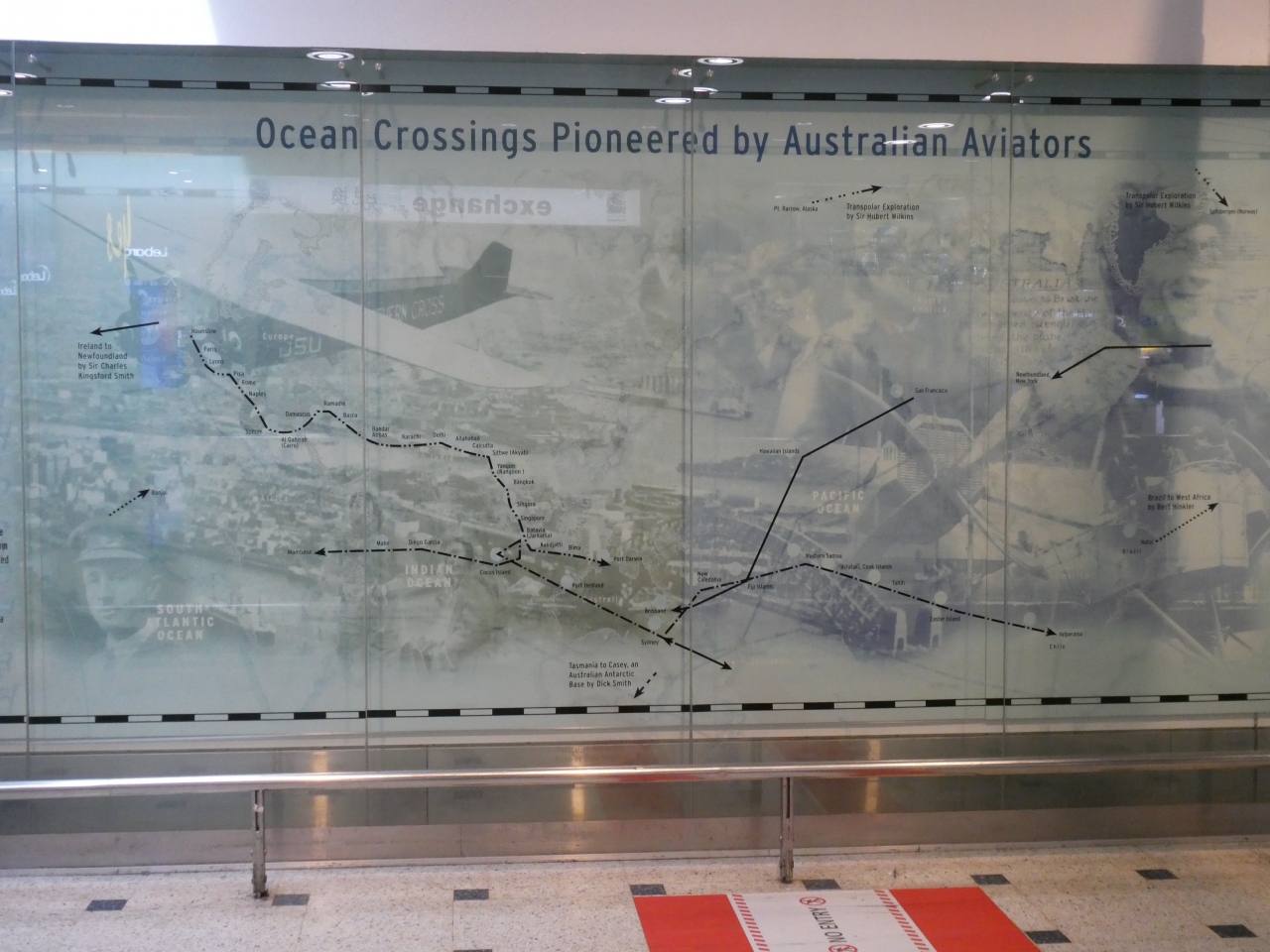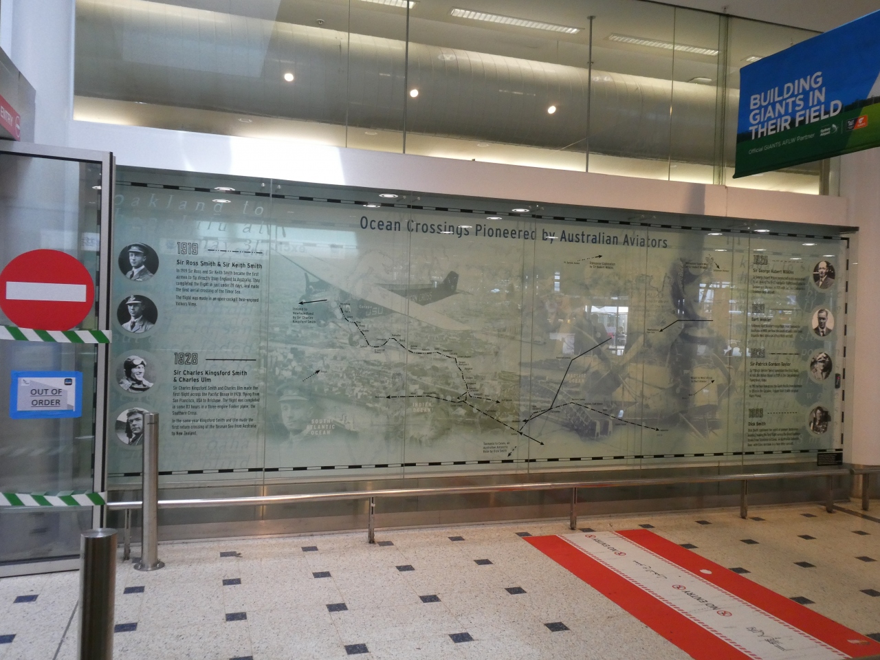 で税関を抜けて国際線A到着口の脇に何やら「Ocean Crossings Pioneered by Australian Aviation」と言う大きなガラス転写作品を今回発見してじっくり観察してきました。