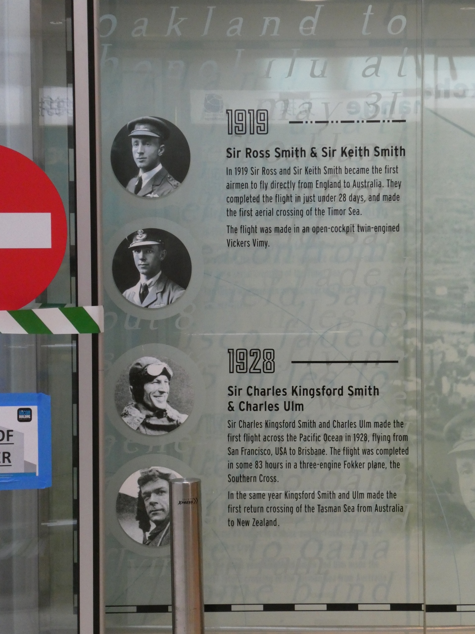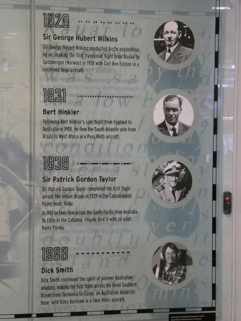これはかつて欧州や南太平洋・北米から豪州まで洋上横断飛行した空の冒険家達の顔写真と地図・飛行機・各移動航空経路と豪州航空史の歴史案内板でした。