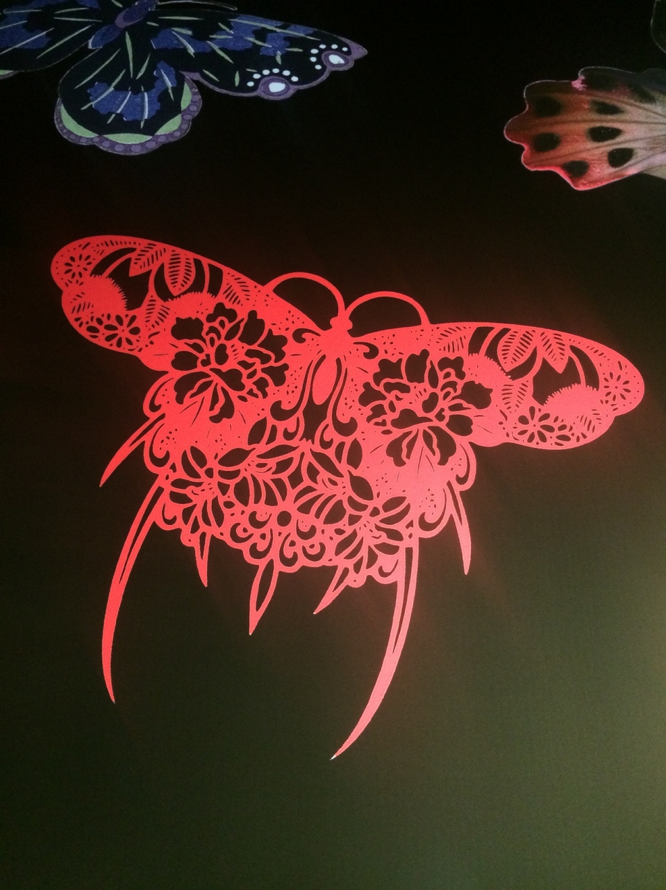 チケットは30元です。入口でお金を払うと当日券を渡されて、そのバーコードを読み取らせて入りました。展示がたまたまちょうちょの展示だったので、ちょうちょの絵画、墨絵、ちょうちょの繁殖の様子などがそろっていました。
