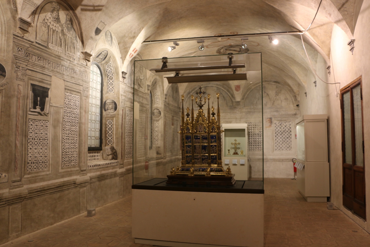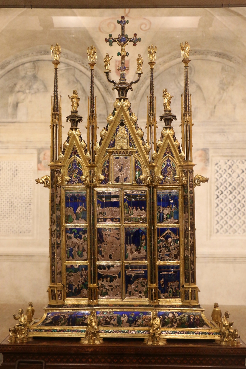 シエナの職人ディ・ヴィエーリが聖遺物(聖体布)を納めるために制作したもので、貴金属と七宝を使用したパネルには「イエスの生涯」や「ボルセーナの奇跡に因んだ場面」が描かれています。大変美しい見事な作品ですので必見です。