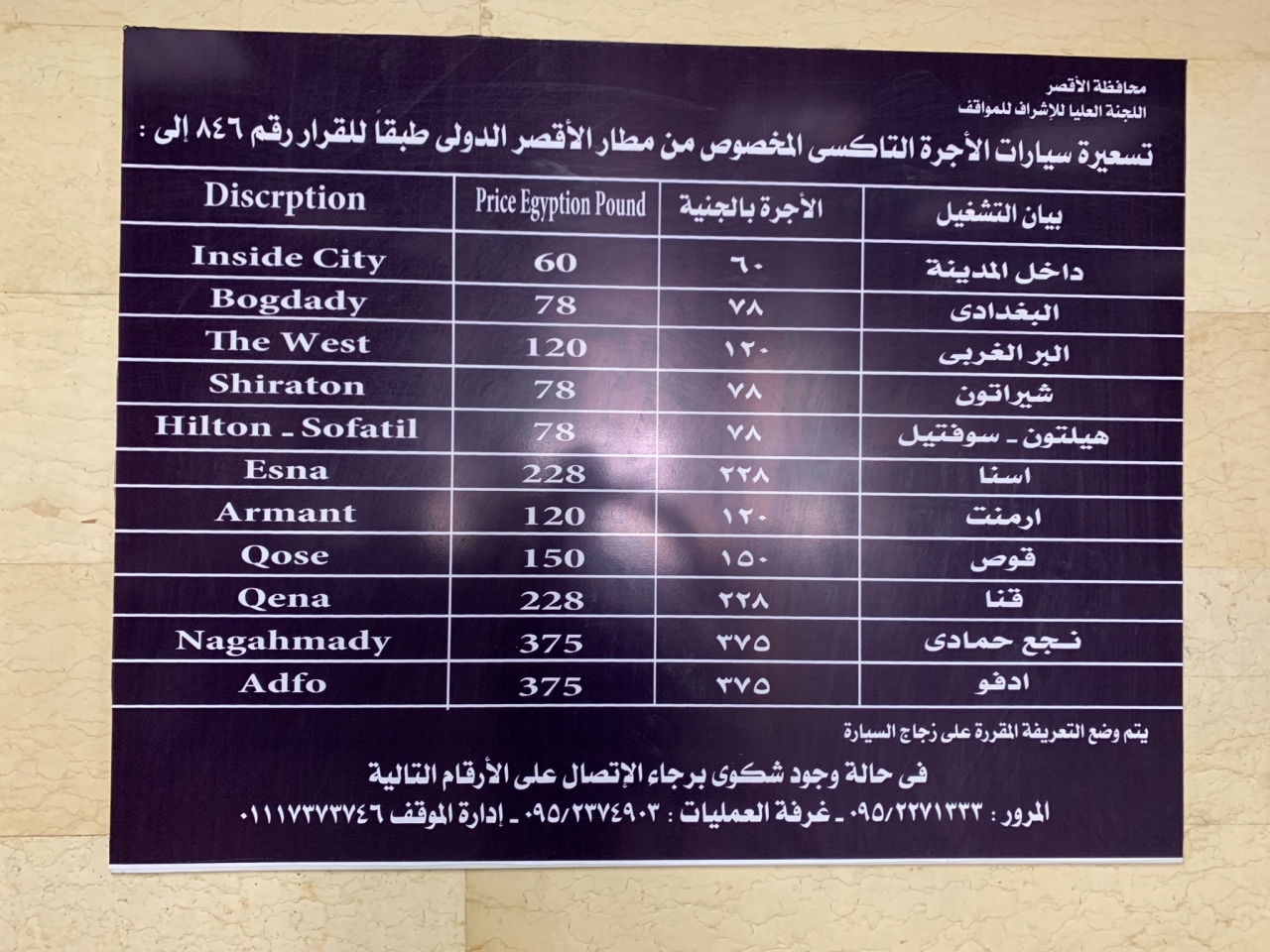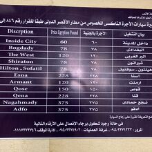 ルクソール空港到着後、タクシー乗り場へ出ると、運転手さんたち数人がのんびり車の外で待機中。私を見るなり客の取り合いっぽい雰囲気に。ちょっと笑ってしまった(すみません)到着ロビーに掲げてあるタクシー料金表はあてになりません。エジプトポンドより米ドルのほうが喜びます。