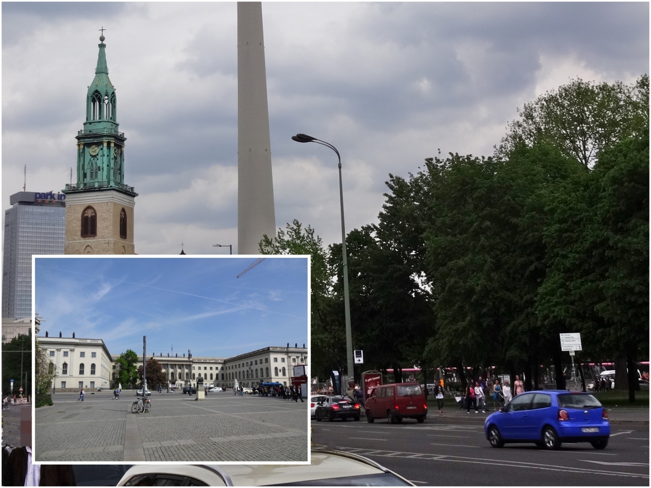 ウンター・デン・リンデンUnder den Lindenは、東のベルリン王宮と西のブランデンブルグ門を東西に約2キロにわたってつなぐ一直線の菩提樹の並木道。沿道には、フリードリヒ2世ら偉人モニュメントのほか、ベルリン大聖堂のような歴史的建造物、フンボルト大学(写真左下)、聖マリア教会・テレビ塔(写真)などが数多く建ち並んでいて、観光客で賑わっていたが、徒歩で散策し良い運動にもなった。