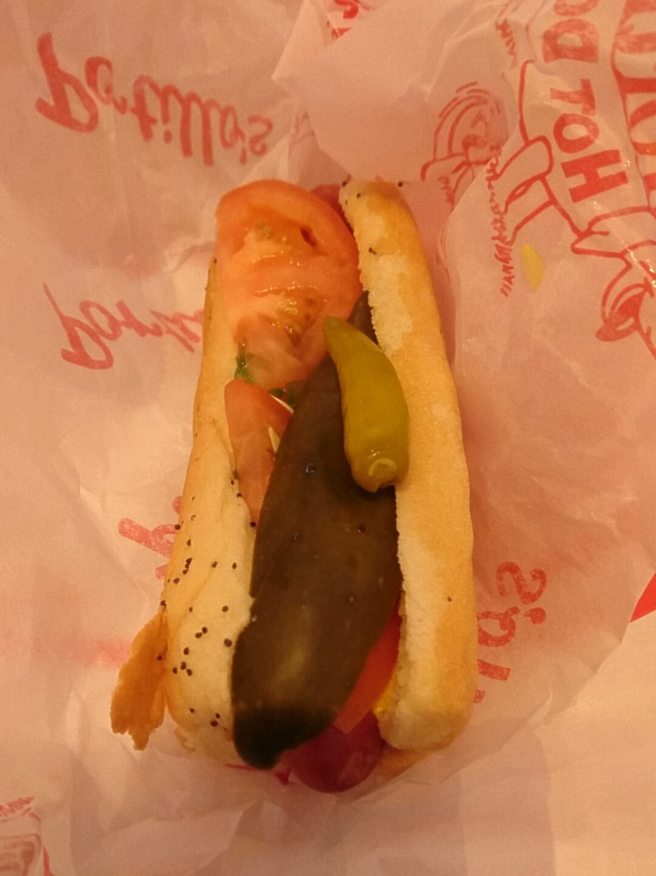 リバーノース地区にある、ホットドッグが有名なお店です。レトロアメリカンな雰囲気で可愛らしい店内でした。ケチャップはかかっておらず、ソーセージの他はピクルスやトマトが入っており、さっぱりと食べられるホットドッグでした。