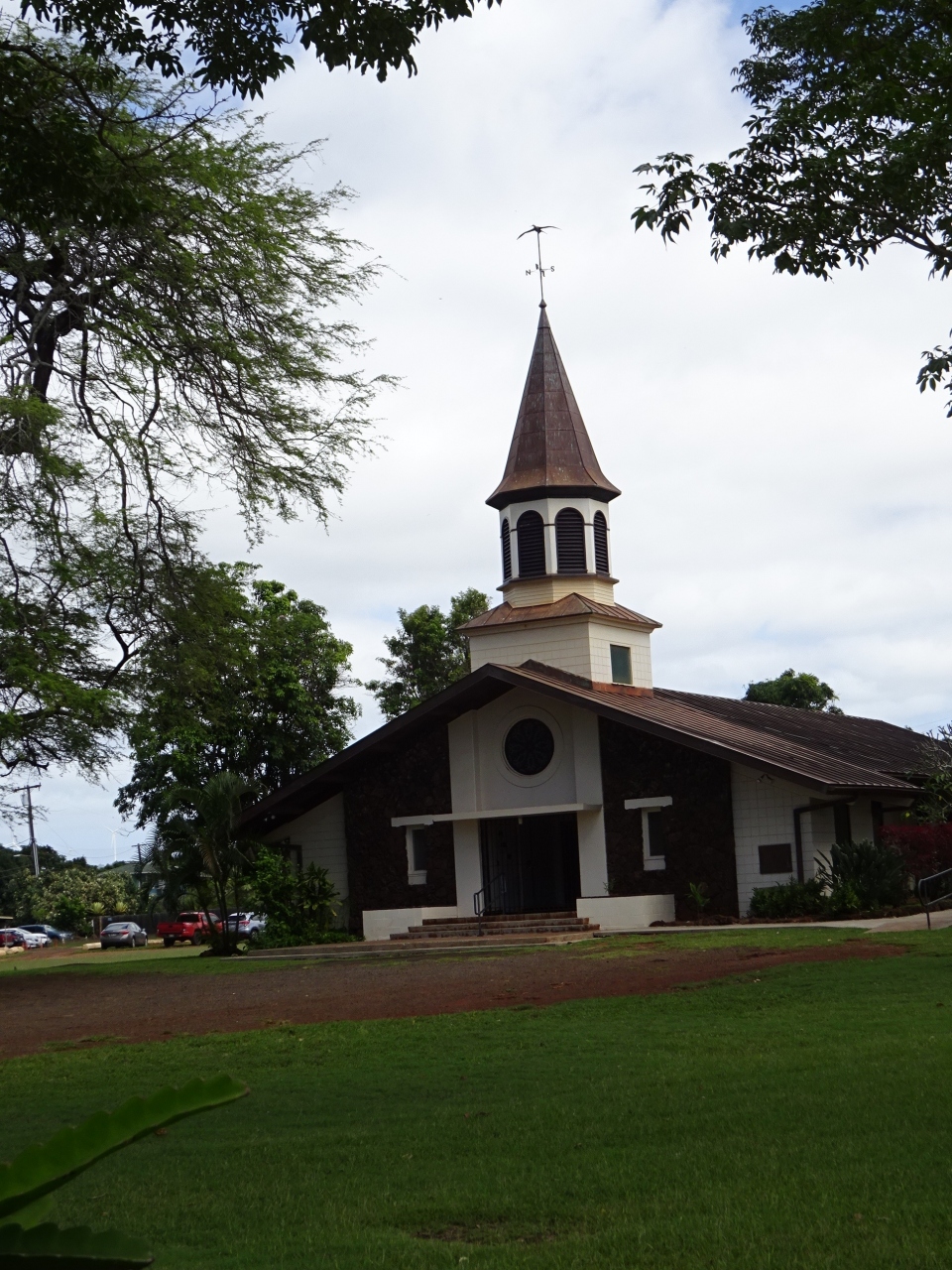 カメハメハハイウェイという派手な名前とは違って片側1車線の狭い道を海の方に向かって歩いていると石組のアーチがあってその奥に教会がありました。