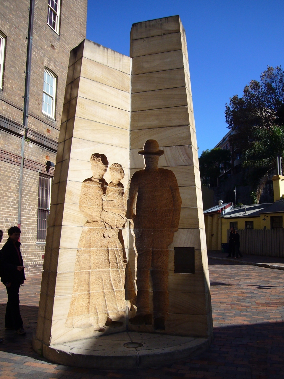 ジョージ・ストリートGeorge Streetからプレイフェア・ストリートPlayfair Streetという歩行者専用の小道に入ると、開拓時代の建物を再現したレストランやギフトショップが並んでいた。この通りの入り口に、砂岩で造られた彫刻、ファースト・インプレッションThe First Impressionsという入植記念碑があった。当時の兵士・囚人・移民の姿が3面に彫り込まれた記念碑なのだそうで、観光客らが写真を撮っていた。