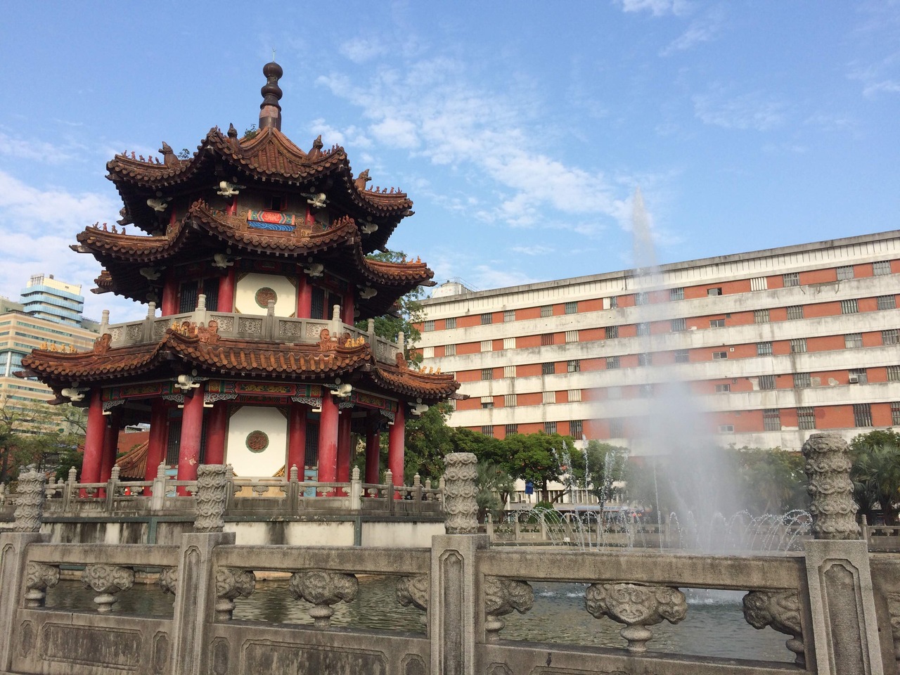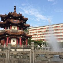 今回は、涼亭の周りの池が噴水になっていて、とてもにぎやかな感じでした。公園内は、この涼亭以外も休憩所みたいなところがありました。定期的に手入れをされて、大切に保存されているようで色もくっきりしていました。