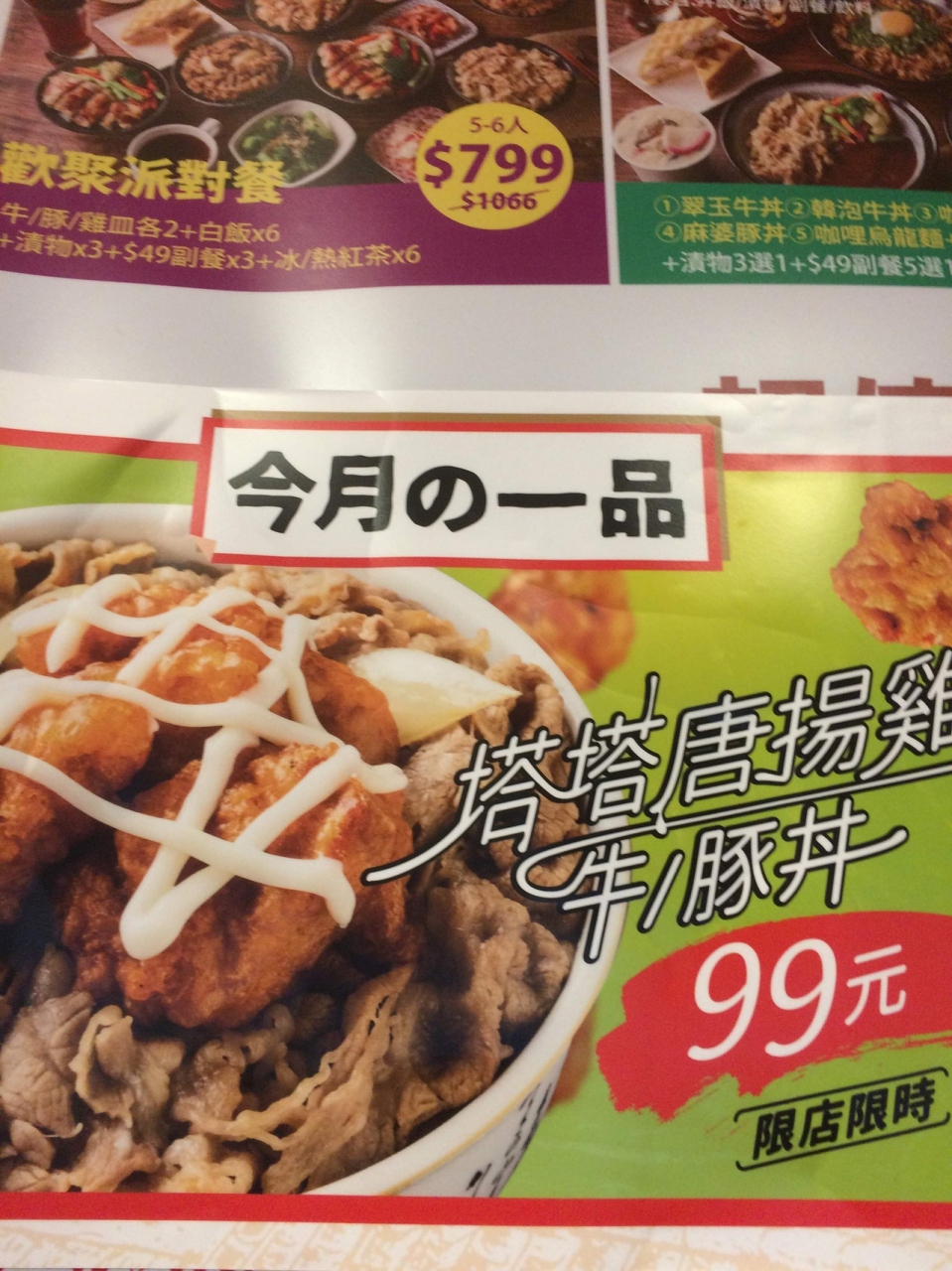 台湾でも吉野家があったので、吉野家の勢いを感じました。台北駅からすぐのところにありました。サービスは普通でした。だいたい200元せずにセットで食べれます。台湾の和食は、お味噌汁が甘い所もありましたが、ここは日本の味でした。