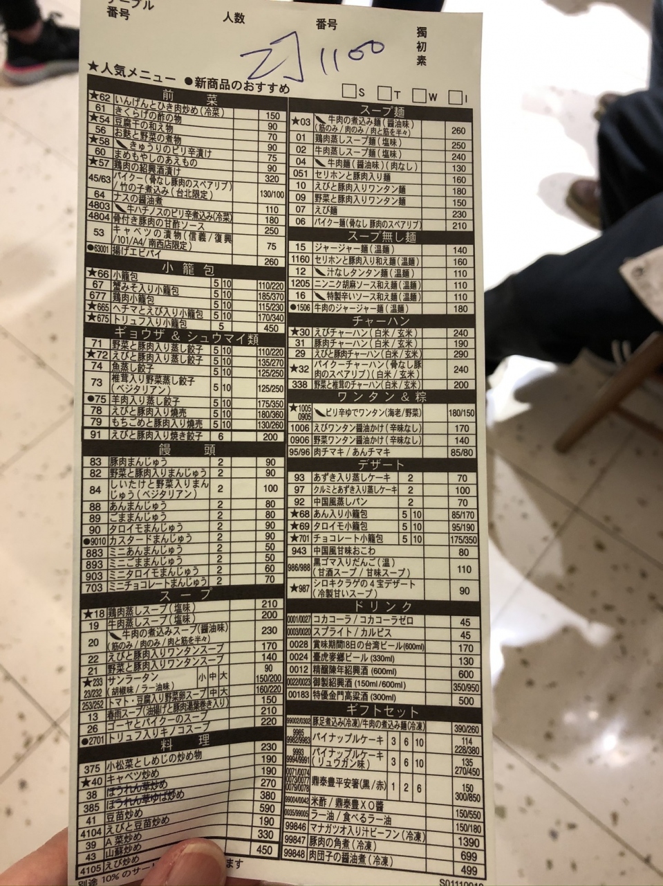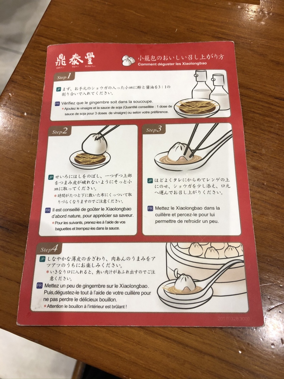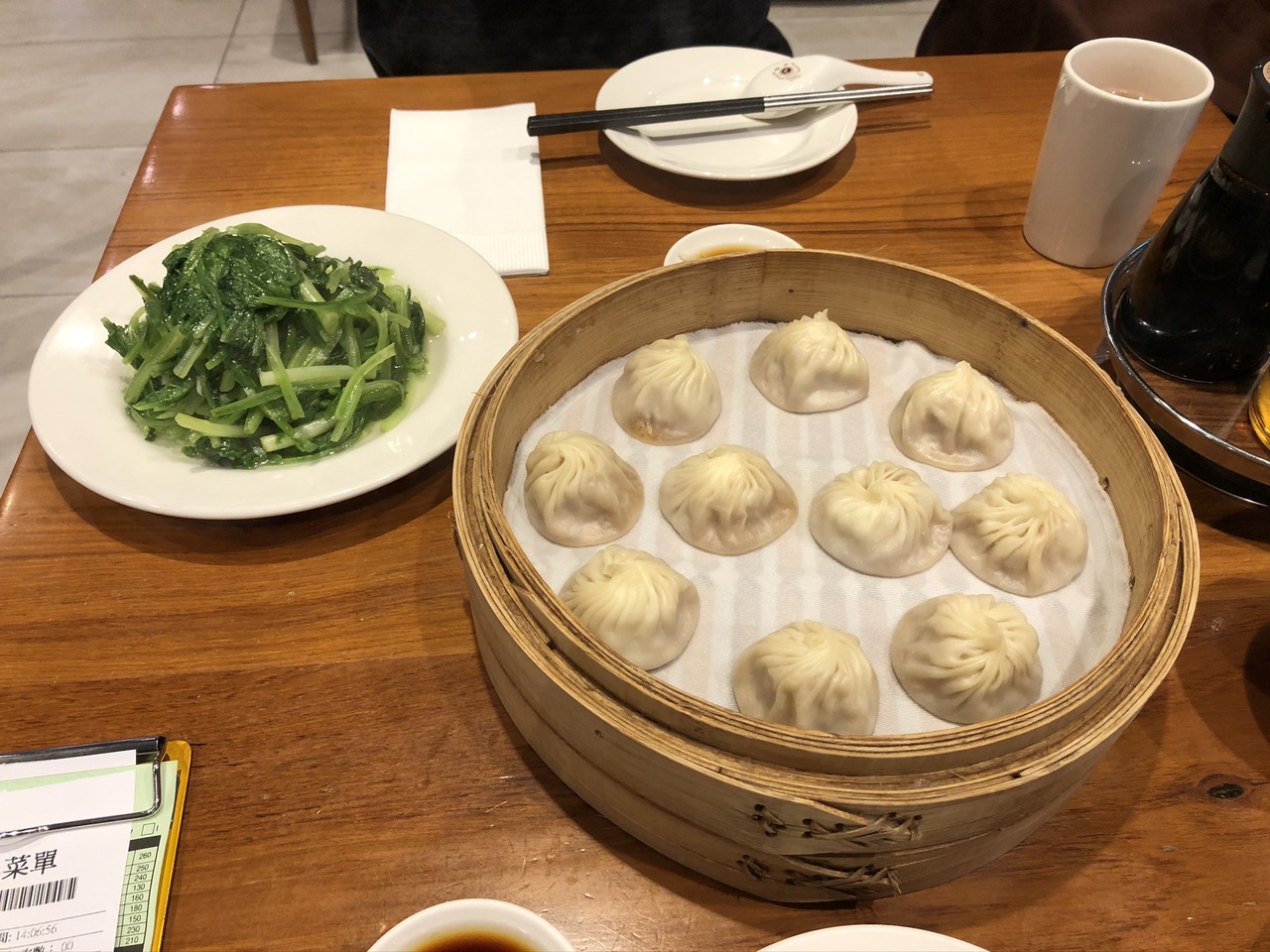 旅行最終日のお昼に訪問。最初、新光三越の台北駅前店に行ってしまい探しても無くて違う店舗だと気づいてから徒歩で行きました。土曜日のお昼で50分程待って案内されました。注文伝票は日本語で書かれるのでわかりやすかったです。店内はキレイで店員もお客さんも多かったし人気店でした。小籠包、A菜炒め、パイコーチャーハンを注文。パイコーチャーハンはお肉がハンバーグみたいであまり美味しくなかったです。