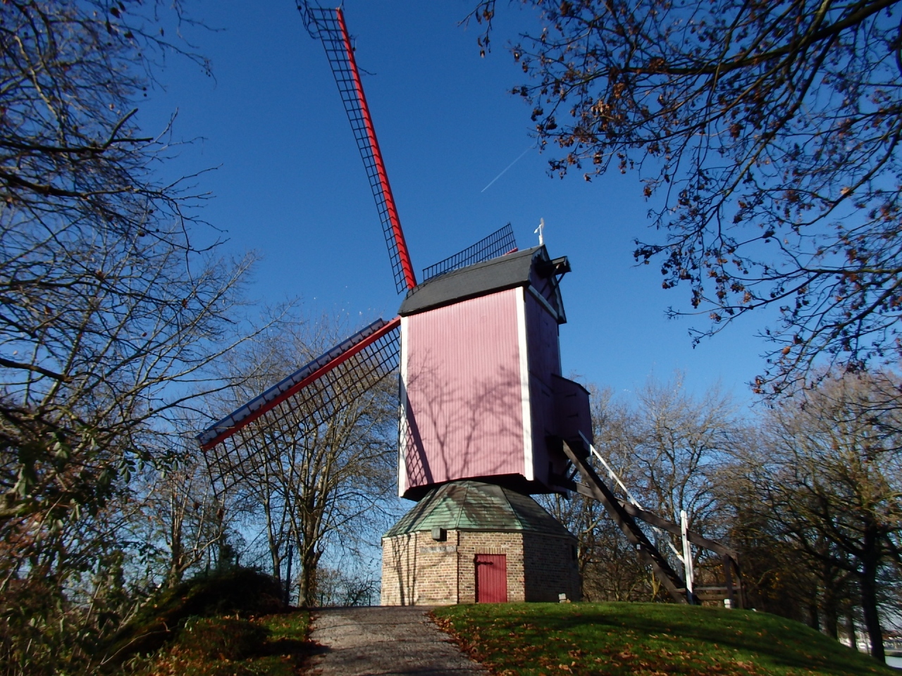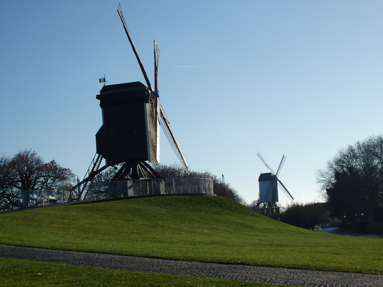 公園に出て北側からWindmill、真ん中にSint-Janshuismolen、その南にBonne-Chiere mill、製粉用の風車が100メートルから200メートルほどの間をあけて並んでいます。聖ヤンハイス風車は1770年に建てられたもので、ミュージアム・パス利用して内部見学ができるのですが、4月~9月のみの公開です。また、ボンヌ・シエール風車は1888年に東フランドルのオルスヌに建てられた風車で、1911年にブルージュに移された風車なんだそうです。