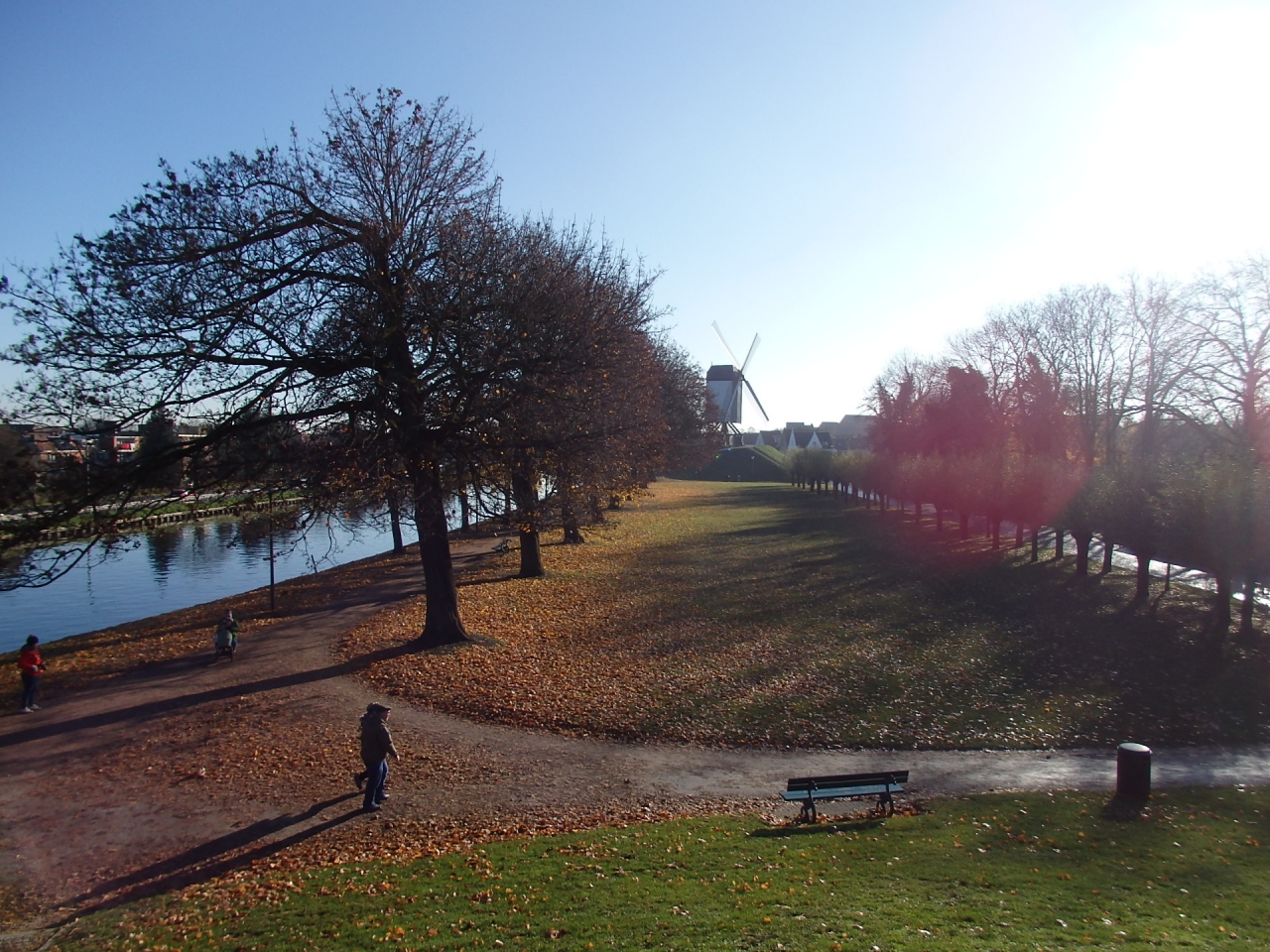 町の中心地マルクト広場からブルグ広場を経由して北東へ徒歩15分ほどかかる民俗博物館からさらに北東へ歩くこと7~8分で運河沿いに出ますと、Park Kruisvestという緑豊かな公園に出ます。17世紀には城壁に沿って30基の風車があったそうですが、現在残されているのは数基のみ。