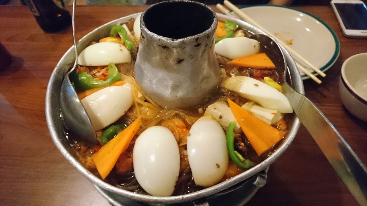 初のチベット料理。日本ではなかなか食べられないが、セットは2人分でNPR1,450と手頃。まず初めに、じゃがいも・玉ネギ・にんじんのケチャップ炒めが登場。日本にもありそうな懐かしい味。続いて、ベジ・チョウメン。これもあっさり味の焼きそばといった感じ。ベジ・モモはチベットモモなのでまさしく日本の焼餃子のような形状。モモのソースはペースト状の野菜がベース。メインのギャコク鍋は、醤油味っぽいベースのスープにキャベツ、ピーマン、ニンジン、じゃがいも、きくらげ、春雨、ゆで玉子、豆腐、肉と具だくさん、量もたくさん。これに丼めしとジャスミンティーが付いており、エベレストビールNPR450を飲んだせいか、不本意ながら満腹になって完食できず。多人数での来店をお勧めします。