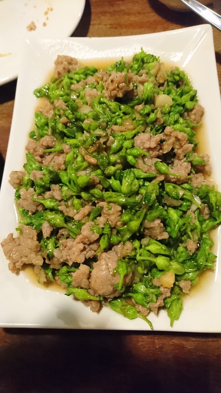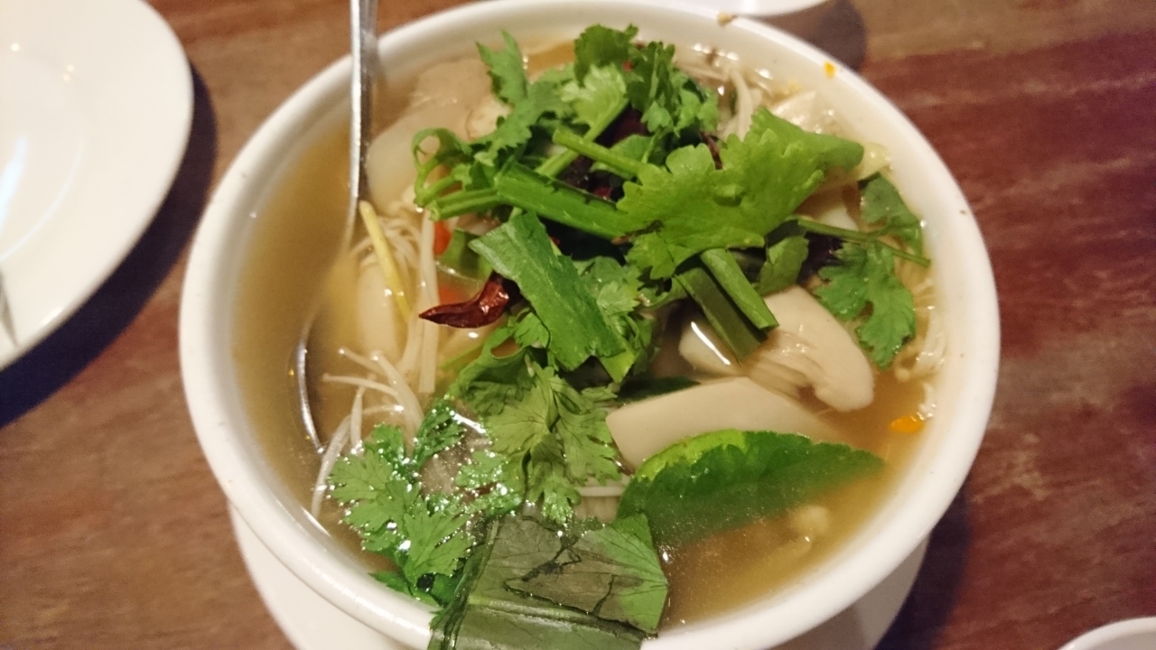 3月に続き2度目の訪問。メニューが豊富で他店では見かけないものも。まずはマッシュルームの酸っぱ辛いスープTHB150。前回の海老と野菜の酸っぱ辛いスープと具が違うだけでベースは同じ。トムヤムクンも美味ですが、ココナツミルクの入っていないクリアなスープは朝から食べられそうなほどさっぱりとして美味。続いてはラープ・ウンセンTHB150と夜来香と牛挽肉のオイスターソース炒めTHB150。ラープウンセンは、唐辛子やマナオが利いた挽き肉と春雨の和え物で、炒った生米が少し加えられており、生のキャベツやミント、ねぎなどのつけ合わせとともに食します。夜来香と牛挽肉のオイスターソース炒めは、唐辛子の辛味はほとんどなく、夜来香(花のつぼみ)の若いアスパラのような食感が心地よく、ごはんに絶妙にマッチ。最後は前回満腹で頼めなかったグリーンカレーオムレツTHB170。グリーンカレーを薄焼き玉子で巻いただけのシンプルな一品ですが、ビールともごはんともよく合います。大瓶ビール2本飲んでしめてTHB885(日本円で3000円ちょっと)と、物価上昇のバンコクにおいては価格も満足です。