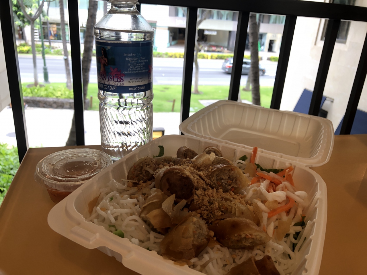 レタスがいっぱい敷かれた上に米粉の麺、その上に春巻きがのって10ドルほどです。