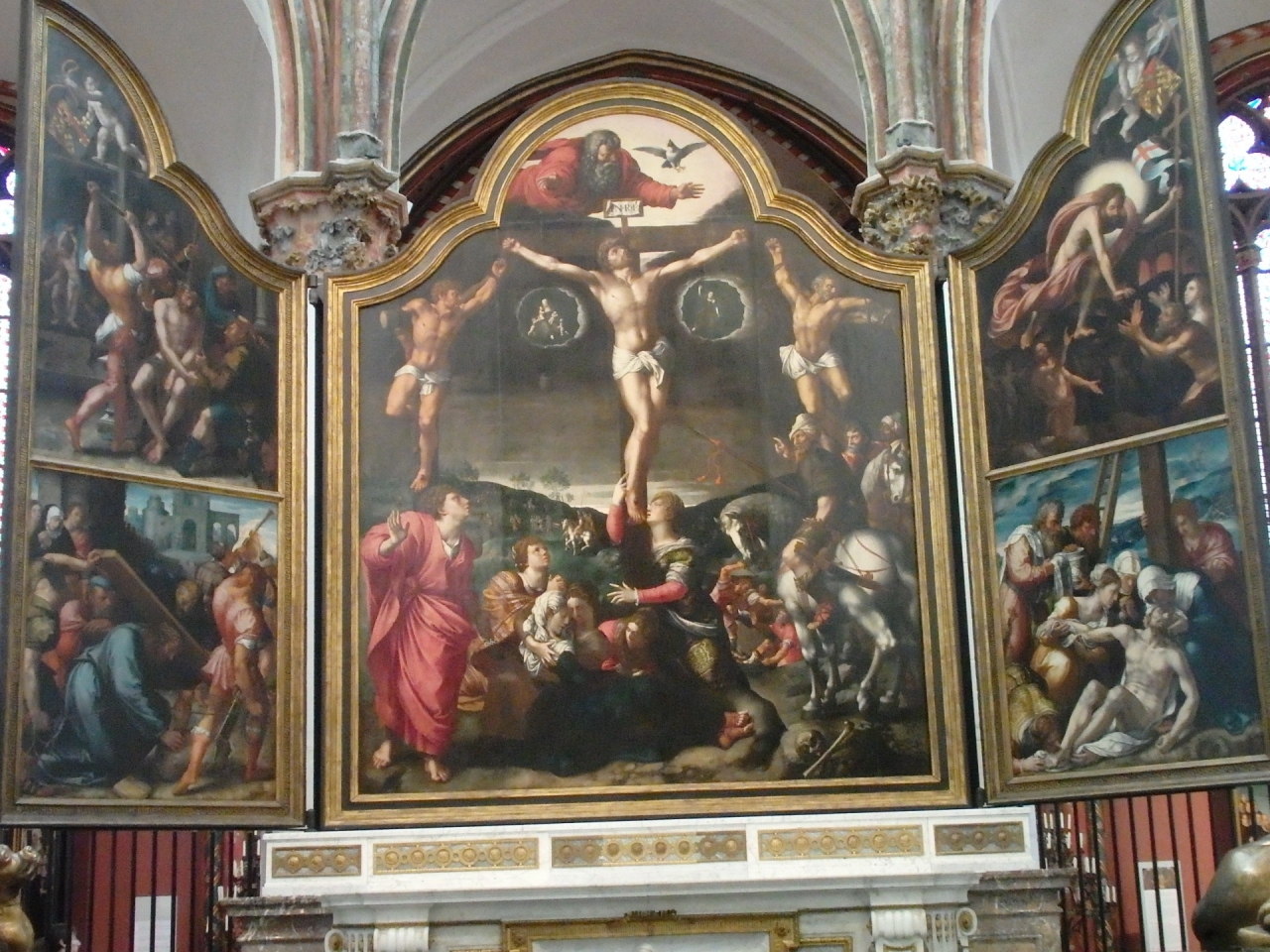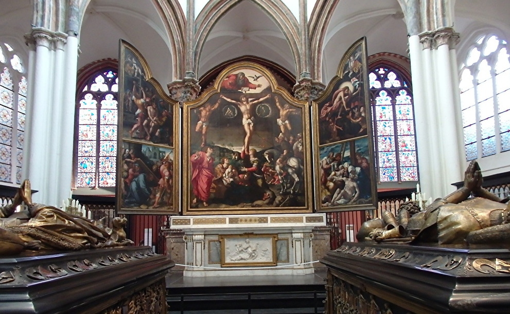 教会内の主祭壇やパイプオルガンも見逃せないもので、南翼にあるミケランジェロの聖母子像は気品のあるものです。荘厳な雰囲気に包まれる内陣には、ブルゴーニュ公国のシャルル公や娘のマリーの霊廟があります。