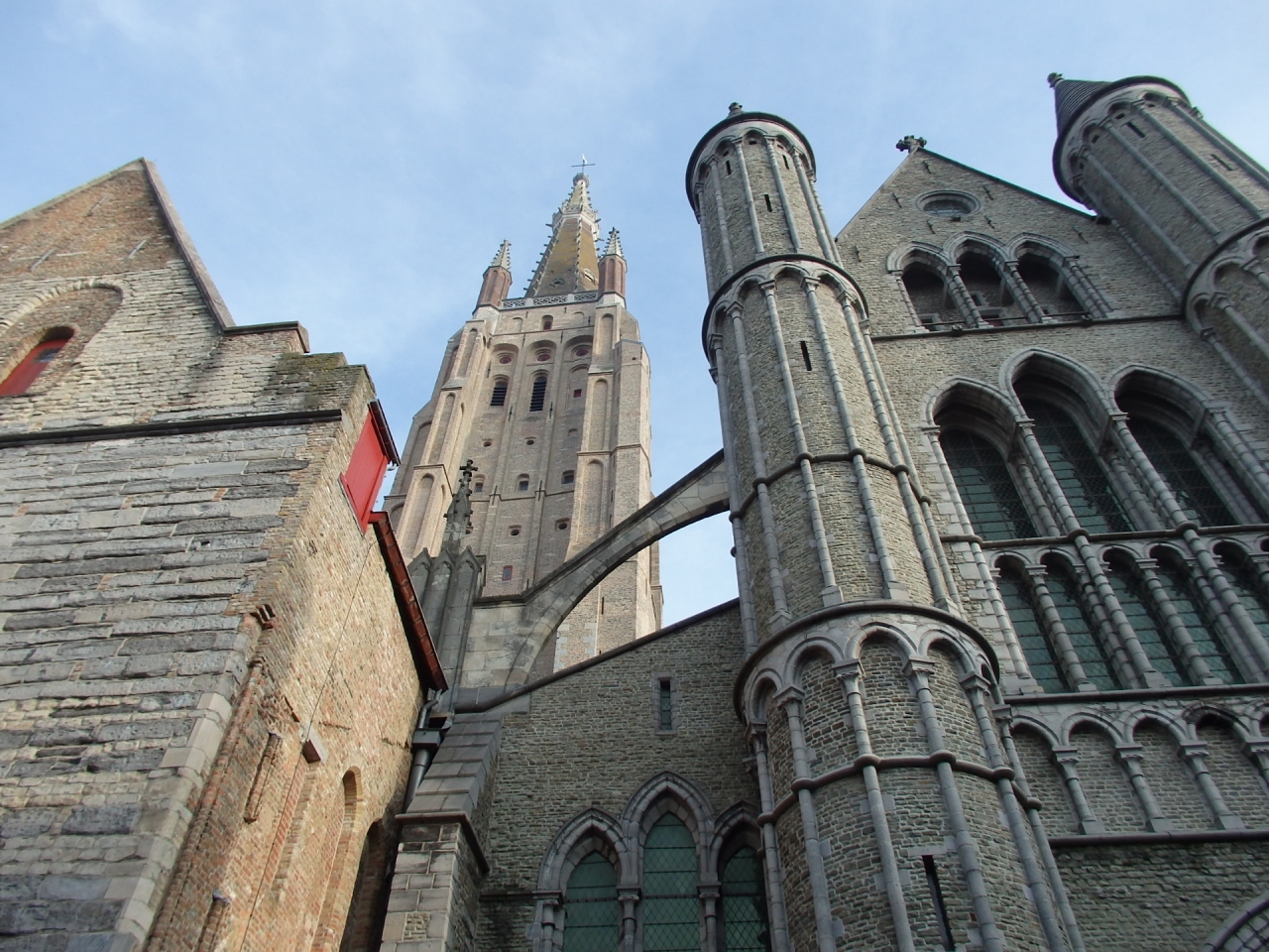 グルートゥース博物館や聖ヨハネ施療院の近くにある聖母教会は、10世紀以前から存在し、12世紀初頭にロマネスク様式で建築されたが1116年に焼失後、「トゥルネー・ゴシック」様式で改築され、改修工事が何度も繰り返され様々な建築様式が混在しています。北側の尖塔は崩壊後に、第二次市壁と同じく西フランデレン産の煉瓦を用いて1361年に完成したもので、高さ122メートルあり町中のどこからも目に入る存在です。