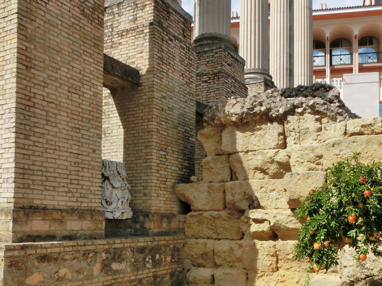 コルドバ市庁舎の隣で発見されたという、古代ローマ時代の神殿の遺跡です。白いコリント式の柱がきれいに並び目を引きましたが、復元されたものだそうです。その手前の地面に転がすように無造作に置かれている大理石の柱頭や柱の断片の方こそが、オリジナルのものでした。