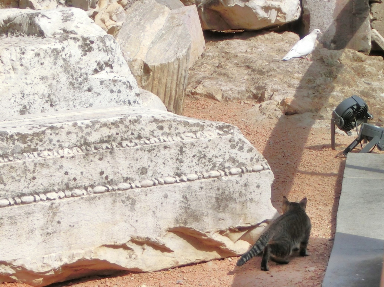 そして古代ローマ遺跡につきものの、神殿在住の猫の姿もありました。遺跡内にやってきた白い鳩に狙いを定め、おしりをふるなど、神殿敷地内で活発に活動していて、神殿よりも猫の見学の方が楽しめました。
