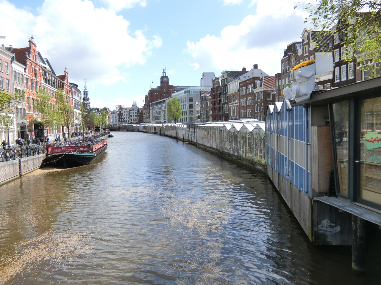 運河沿いにビニールハウスがずらりと並んでいます。ここがシンゲルの花市です。今はチューリップの最盛期なので、色とりどりのチューリップや球根がたくさん並んでいます。ここで球根を買って帰りたかったのですが、検疫に引っかかると思いやめました。