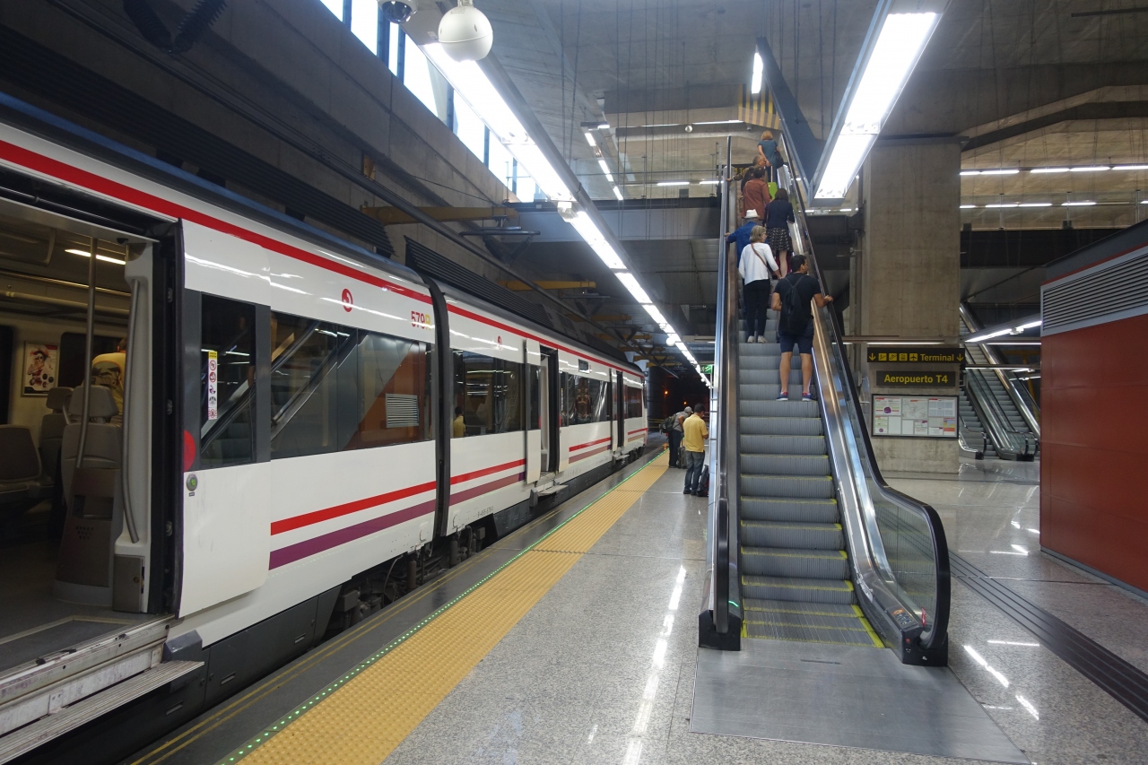 バラハス空港にはメトロだけでなくレンフェ(セルカニアス)も乗り入れています。メトロがT1-T2-T3駅とT4駅の2つ駅があるのに対し、レンフェのほうはT4駅だけ(ターミナル4のみの乗り入れ)。搭乗するフライトがターミナル4発着で、市内の発着駅がレンフェ沿いならこちらを利用するのもおすすめ。