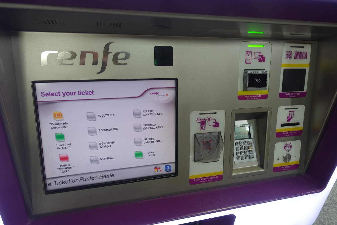AVEのチケットはあらかじめネットで購入したほうが割引されます。安いぶんキャンセルができない制約もあるけど、それでも事前購入のほうが安いと思ってしまうくらい変動が大きいです。そしてAVEのチケットを持っているなら、その前後に乗るセルカニアスが無料で乗れる「Combinado Cercanias」という乗継サービスがあります。自動券売機のタッチパネルで「Combinado Cercanias」をタッチ→行き先を選択→QRコードを読み取り で切符が出てきます。