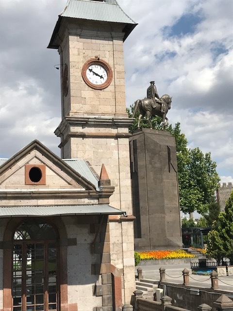 カイセリの中心部の共和国広場に時計塔のすぐそばに立っています。アタチュルクはトルコ共和国の建国の父と呼ばれている人で、トルコの全国民が尊敬しています。第1時世界大戦の後の頃なので騎馬で戦っていなかったとは思いますが、軍人なので騎馬像は似合います。