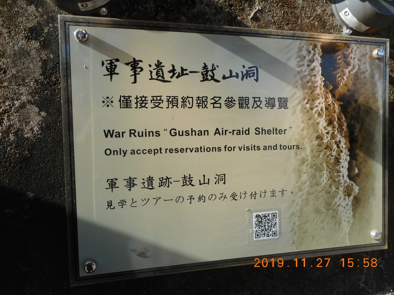 台湾の高雄観光で立ち寄りました。高雄市忠烈祠戦争と和平紀念館見学後、丘を下りていくと、日本語で「軍事遺跡ー鼓山洞 見学とツアーの予約のみ受け付けます」と書かれていた看板がありました。別の板にも日本語の説明があり、防空壕の文字が読み取れました。誰も居ないのでツアーの仕組みなどは分かりませんでしたが、トンネル部分までは入ることが出来ました。
