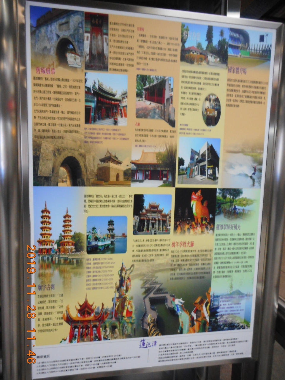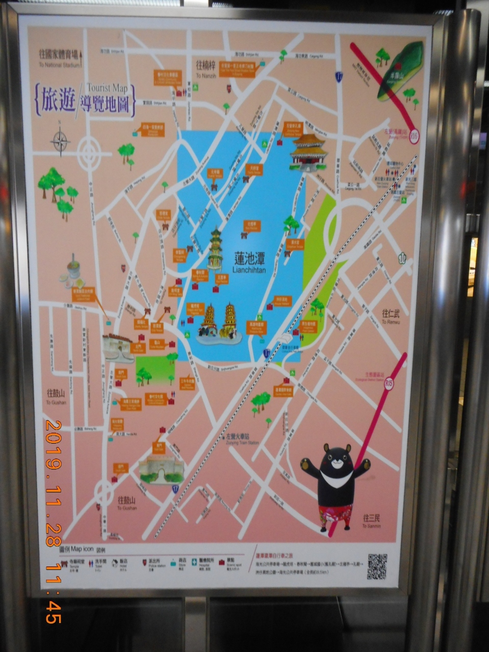 台湾の高雄観光で利用しました。メトロのレッドラインの15番駅です。理由は不明ですが、メトロレッドラインの1番と2番はメトロ路線マップ上では見つかりませんでした。この駅はバス利用で訪問する2つの観光地の最寄り駅です。左營蓮池潭は近い湖岸なら歩いて20分くらいで行けますが、もう一つの鳳山県舊城は方向は同じですが歩くと40分はかかります。