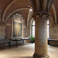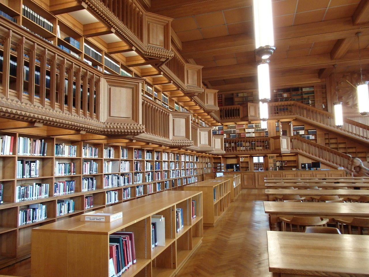 ルーヴェン駅から徒歩10分ほど。広いモンセニュール・ラドゥーセ広場に面して建つネオクラシック様式の建物内に入る大学図書館は、木造の明るい温かみのある広いスペースに、3段重ねのような階層に通路が設置されて蔵書がびっしり並んでいます。長細いデスクがいくつも並ぶ様子は圧巻とさえ言えそう。