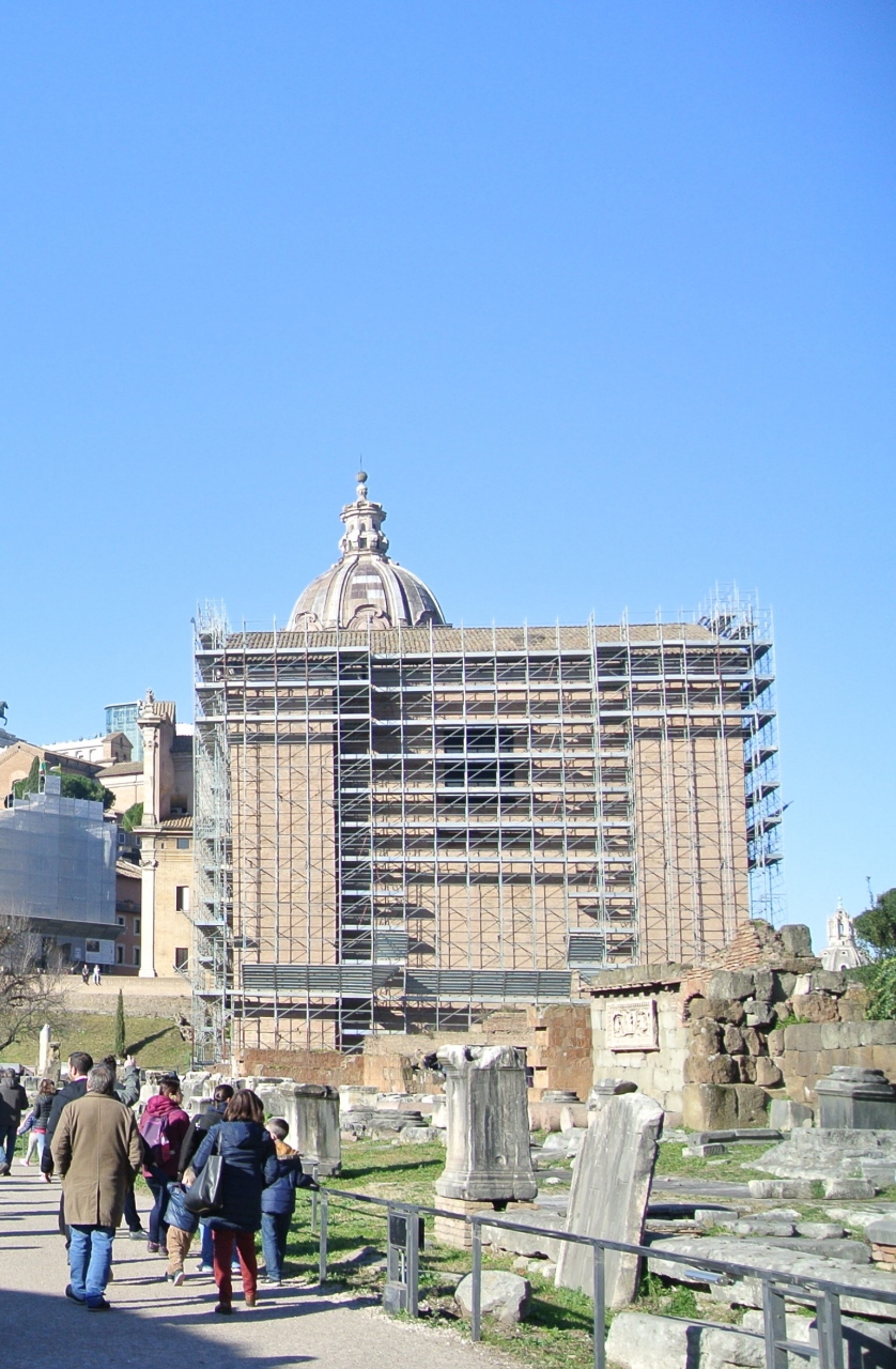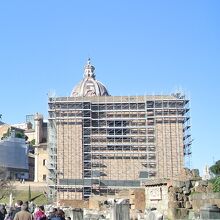 工事中で足場が組まれていましたが、長方形で、装飾のない質実剛健な建物だなという印象でした。窓少なめの書庫のようなイメージを受けました。どの程度修復されたのはわかりませんが、原形がかなりしっかりと残っています。