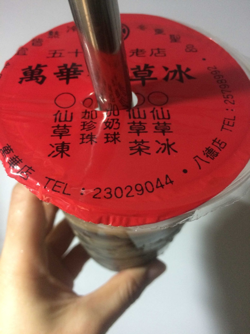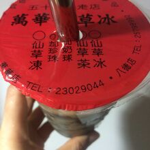 仙草ゼリーの老舗店です。ドリンクなので、プラスチックのカップに入ってストローで飲むドリンクになります。赤い蓋のところに、このお店の商品が中国語で書いてありました。甘さと氷の量も調整できるようになっていました