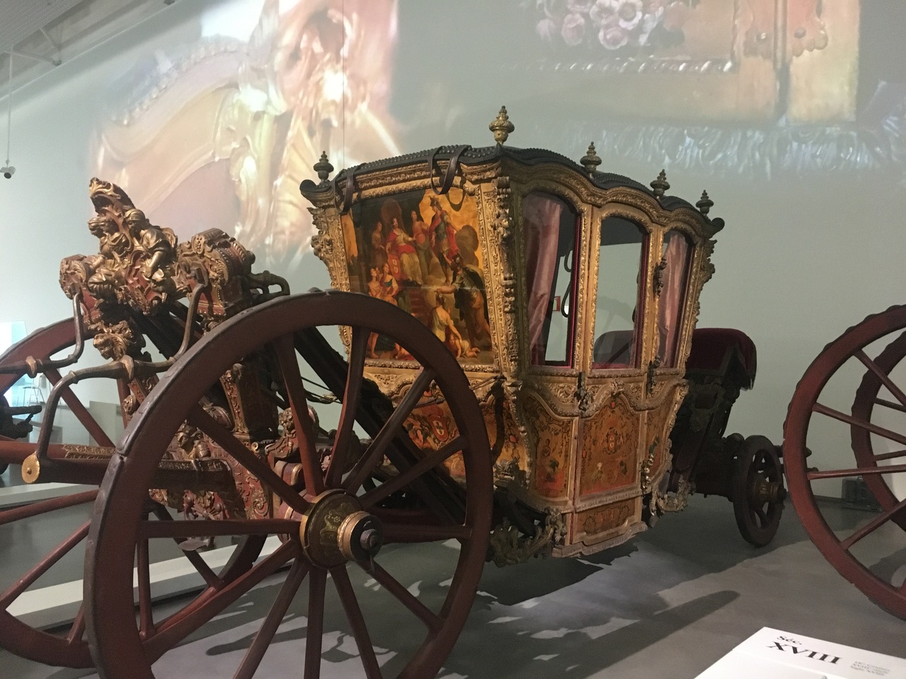 私はシントラから配車アプリのBoltでアクセスしましたが、公共交通機関でももちろんアクセスできます。部屋の左右に豪華な馬車がずらりと並んでいて、中央を通りながら、近くで眺められます。壁にも馬車の映像が投影されていて面白いです。